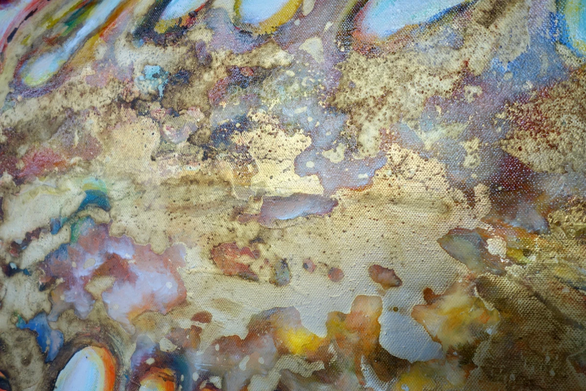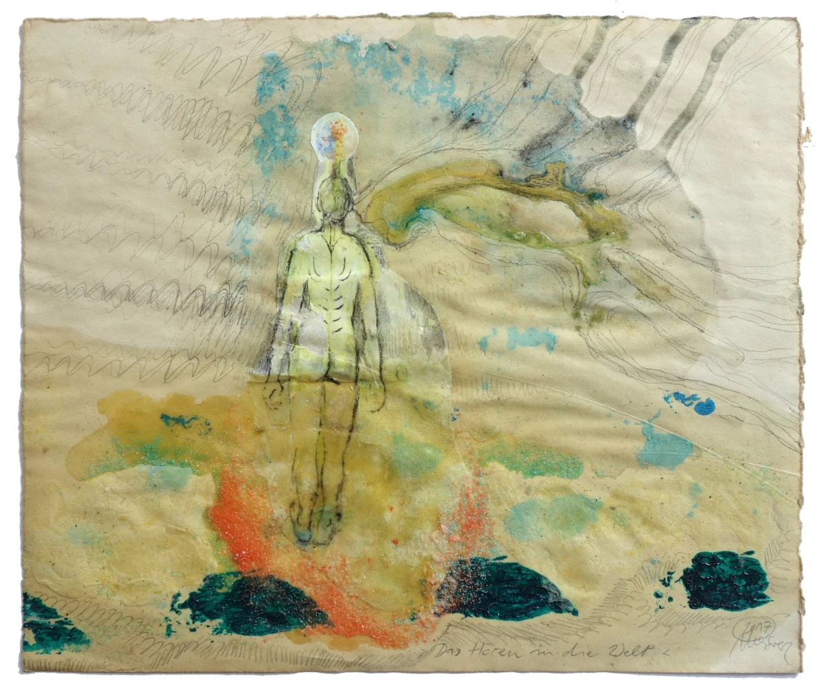 In dem Werk „Das Hören in die Welt“ breitet eine leuchtende, androgyn anmutende Gestalt ihre Hände leicht nach außen geöffnet aus, als würde sie Energie empfangen. Ihre Wirbelsäule verbindet sie nach oben mit einer schwebenden Wolkenform, die wie eine pulsierende Sphäre voller Farben und Strukturen erscheint und nach unten in die Erde durch eine energetische Verlängerung unter ihren Fußsohlen. Strahlen durchziehen die Szene und scheinen die Figur in ein lebendiges Licht einzuhüllen. Unten im Bild lodert feurige Energie in Form von drei roten Pflanzen, während blau wogende Formen wie Wasser oder Wolken die Umgebung beleben. Das Bild pulsiert zwischen den Elementen Feuer, Luft und Wasser und verbindet oben und unten, Himmel und Erde.