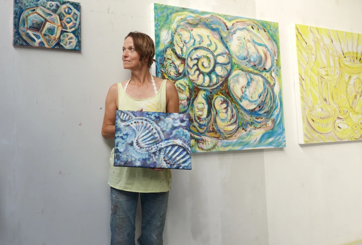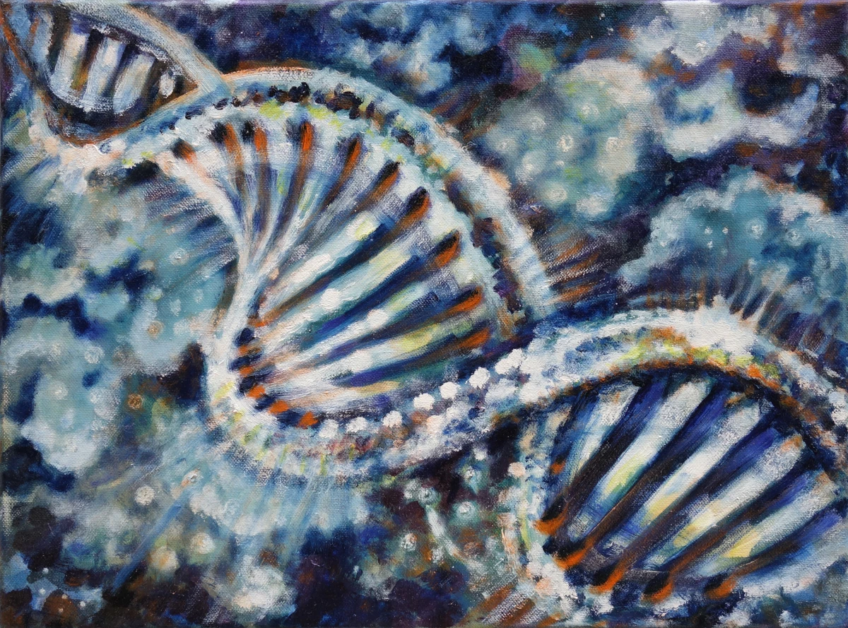 Das Bild „Doppelhelix“ zeigt die Struktur eines DNA-Strangs, dessen komplementären Blauviolett- und Gelborangetöne sowie die mit Weiß gehöhten Lichtreflexe die zwei Spiralen wie in Bewegung erscheinen lassen. Sie entfalten sich aus dem Hintergrund heraus in den Raum. Die dynamische Pinselführung und der leuchtende kosmische Hintergrund verstärken die Tiefe dieses unendlichen Raums.