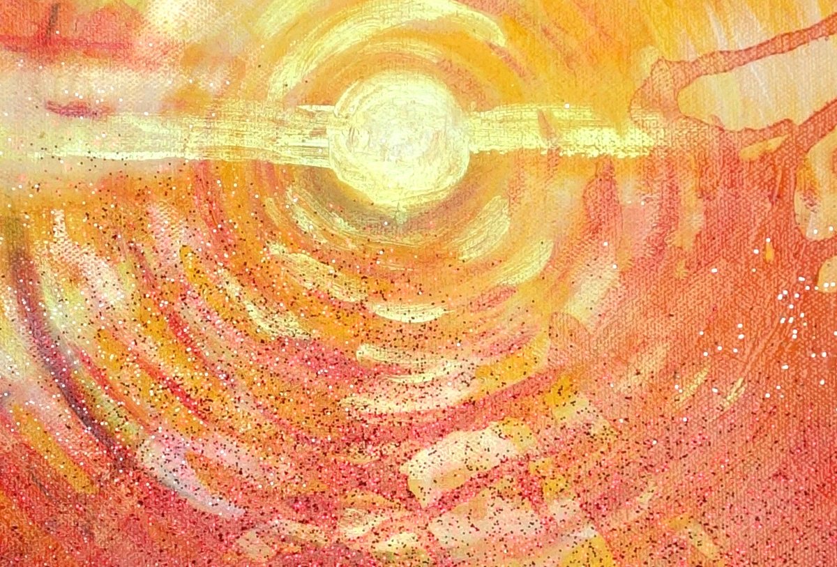 Ölfarbe, irisierende Acrylfarben, Walnuss-Sud, Glitter auf Leinwand