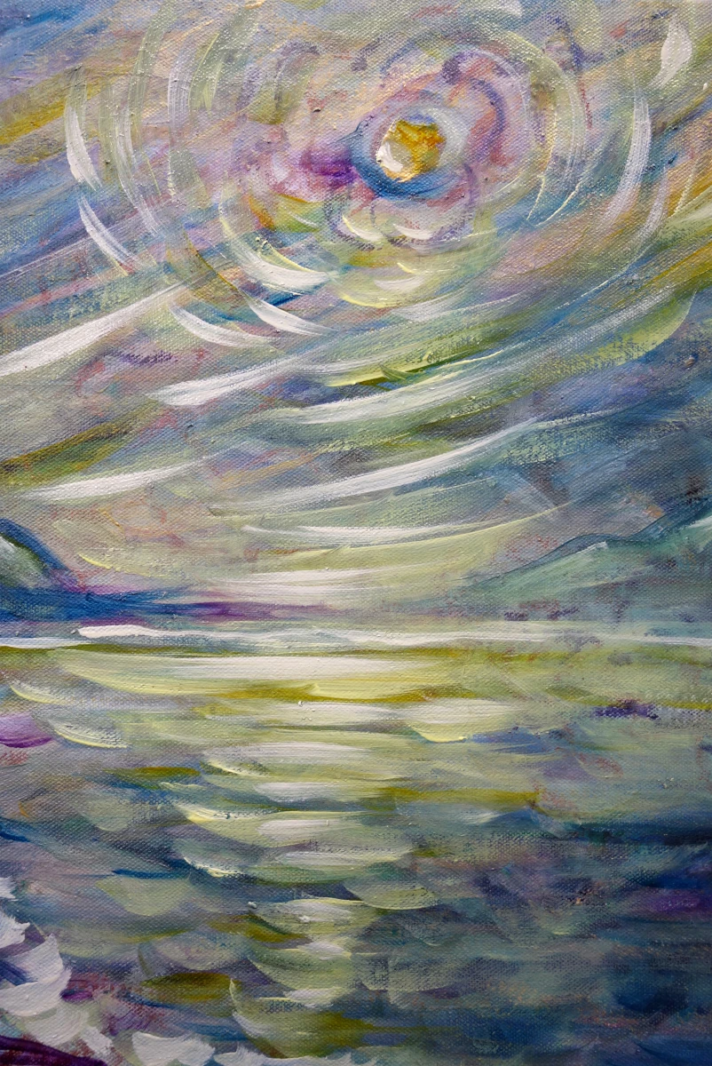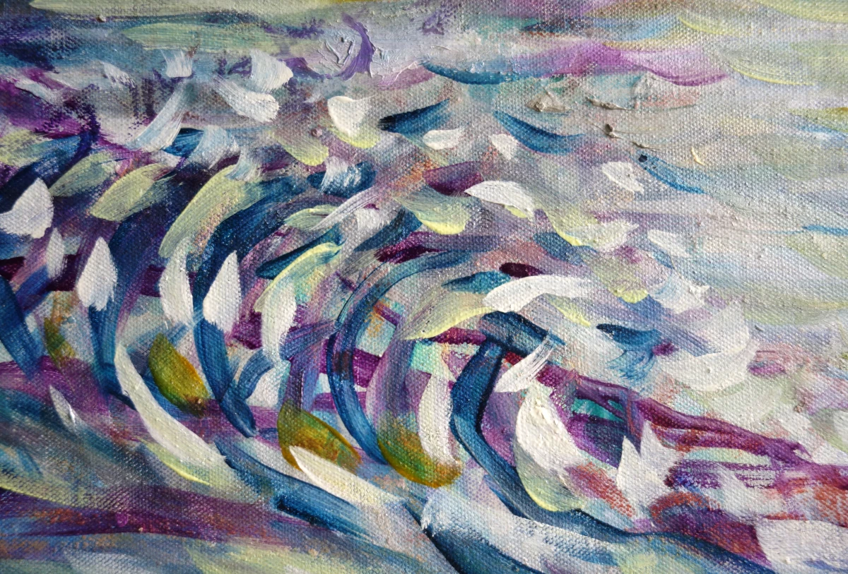 Ein lichtdurchwirkter Himmel öffnet sich über einem Meeresstrand. Lockere Pinselbewegungen im oberen Bildbereich umkreisen den Mond. Sein strahlendes nächtliches Licht breitet sich in diagonalen Schwüngen über dem Himmel aus und spiegelt sich im Wasser. Unten links windet sich eine kraftvolle Wellenform, irisierend in Violett, Blau und Weiß – sie scheint wie eine innere Bewegung, die auf das Licht antwortet.