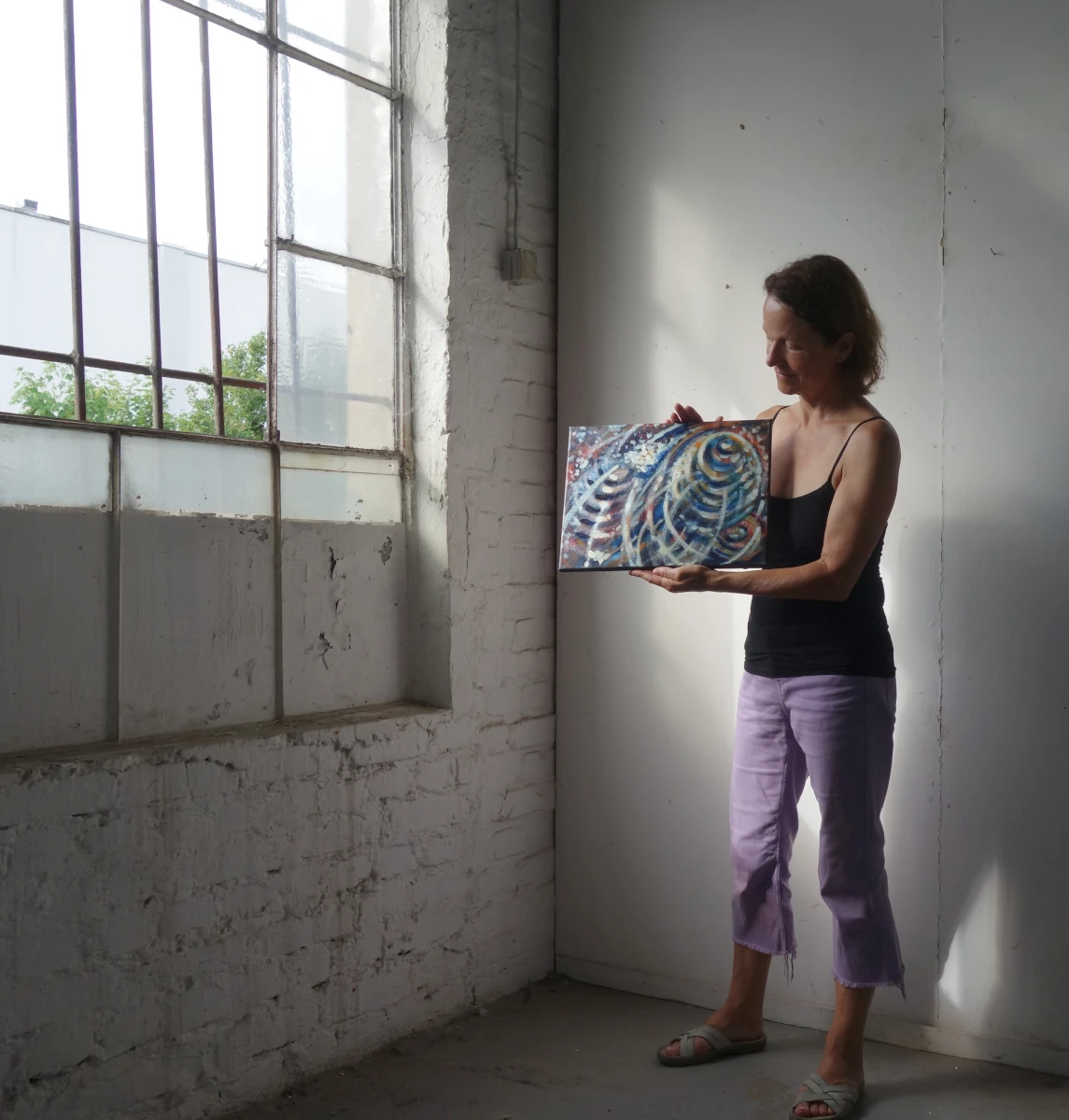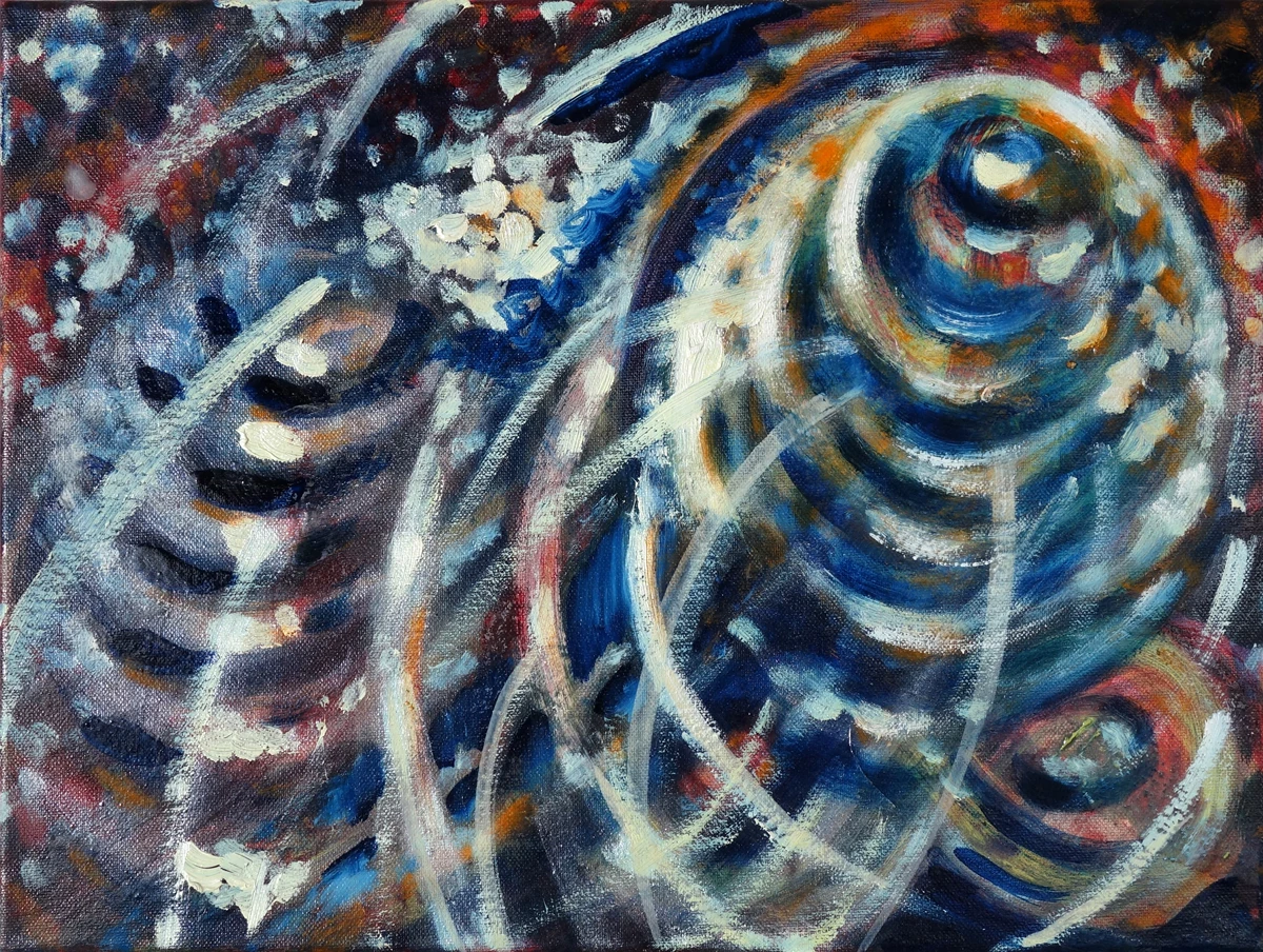 Spiralförmige Lichtbahnen durchziehen einen dichten, farbsatten Kosmos. Wie Energieströme fließen sie durch ein lebendiges Feld aus Blau, Ocker, Weiß und Rot – kraftvoll, rhythmisch, pulsierend. Strahlen, die durch Raum und Zeit wirken. Wir sind erschaffen aus Frequenzen, Farben, Licht – die Verbindung zu unserem göttlichen Ursprung.