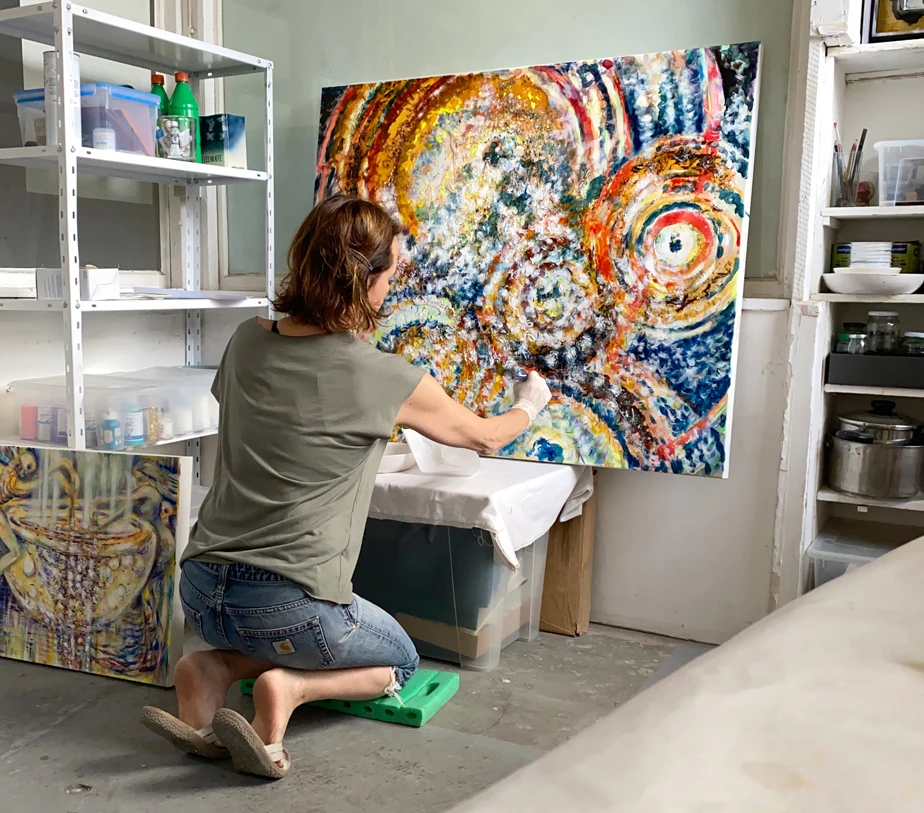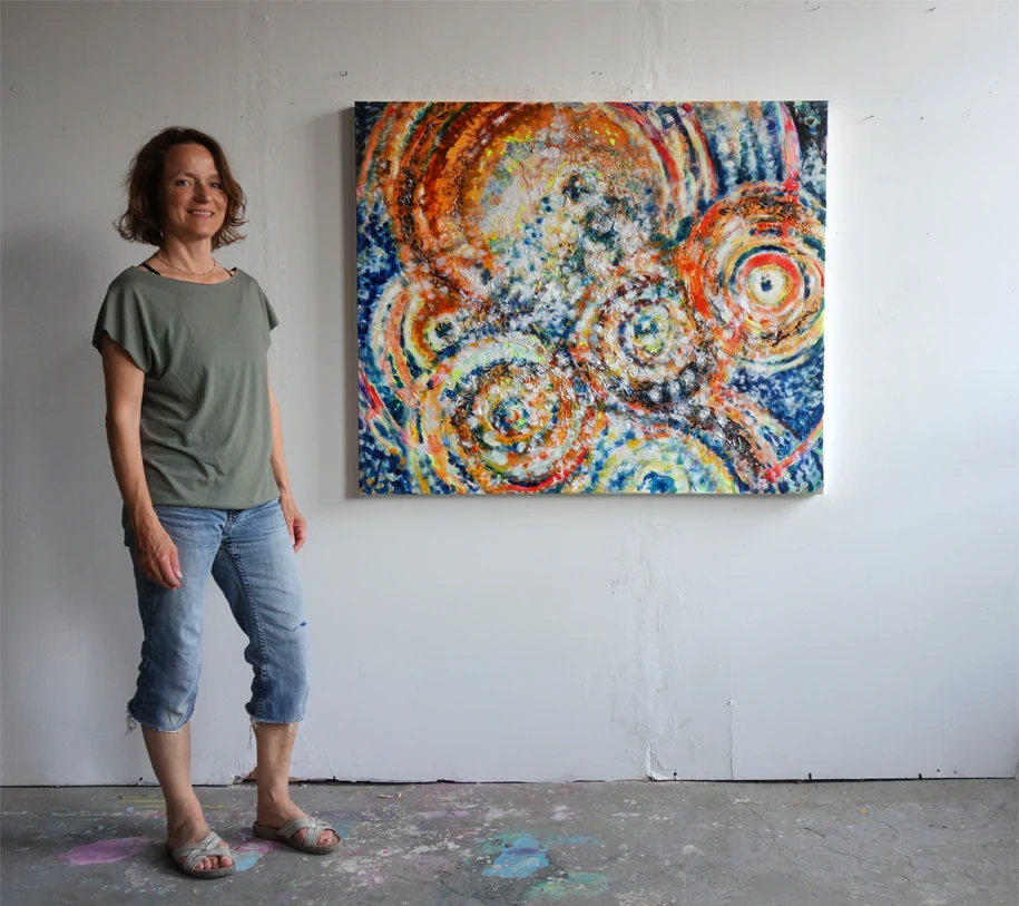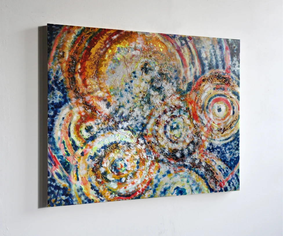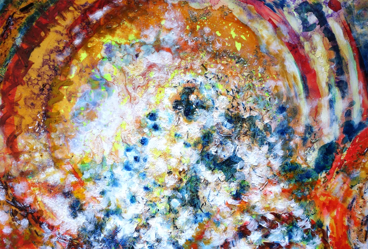 Das Werk „Lichtzellen“ zeigt runde, pulsierende Felder in den Farben Weiß, Gelb, Orange und Rot. Sie durchdringen den blauen Hintergrund in kreisender, fließender Bewegung. Im oberen, mittleren Bildraum flirrt ein Quellbereich kosmischer Aktivität, aus dessen Mittelpunkt weiße Lichtpunkte über die ganze Leinwand strömen. Rote Tuschelinien und mit Gummiarabicum aufgeklebte Blauholzspäne und zerkleinerte Wallnussschalen erzeugen eine dreidimensionale Textur und erinnern an molekulare Bewegungen oder Sternenstaub. Dynamische Farbverläufe lassen das Bild lebendig und durchlässig wirken – als würde es selbst vibrieren.