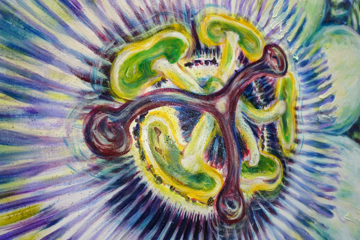 Die Blüte wirkt wie ein Tor, das in eine tiefere Ebene des Daseins führt. Fast scheint sie zu atmen – als sei sie ein Knotenpunkt zwischen Erde und Kosmos. Die Passionsblüte ist seit jeher ein Symbol für transzendente Verbindung. Ihre Struktur und Symmetrie erinnern uns an die universellen Gesetze des Lebens, die sich in Zahlen, Formen und Rhythmen wiederfinden. Doch hinter dem „Wunder“ des Lebens steht auch die „Wunde“ – eine uralte Dualität, die den Menschen und seine Existenz begleitet. Sie erinnert daran, dass Licht und Schatten, Freude und Schmerz, Schönheit und Vergänglichkeit immer zusammengehören.