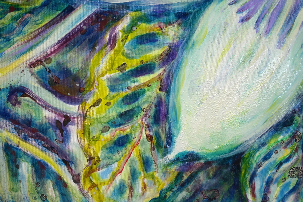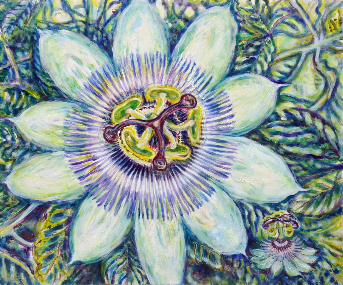 Das Werk „Passionsblüte – Wunder der Schöpfung“ zeigt eine Passionsblüte in all ihrer prachtvollen Komplexität. Die Blume entfaltet sich strahlend vor einem lebendigen, grünen Hintergrund, der das Blattwerk und die organischen Strukturen der Natur spürbar macht. Im Zentrum des Bildes dominiert die Blüte mit ihren 10 symmetrischen, weit ausgebreiteten Blütenblättern, die wie ein Mandala wirken. Ihr Herzstück – 5 auffälligen Staubblätter und 3 filigrane Narben – leuchten in warmen Gelb- und Grüntönen sowie einem kräftigen Karminrot.