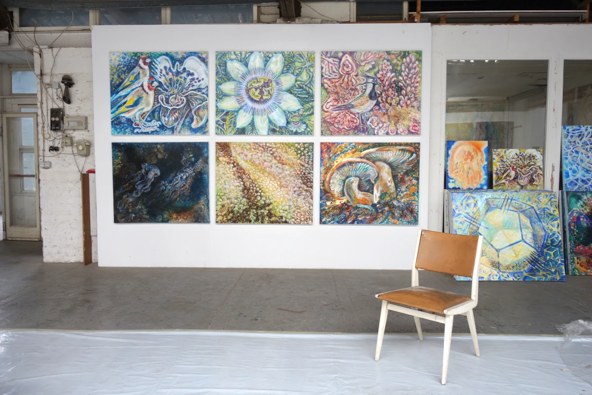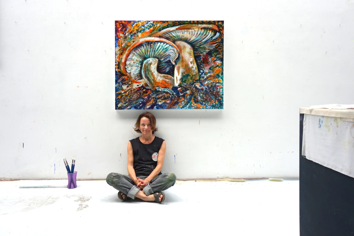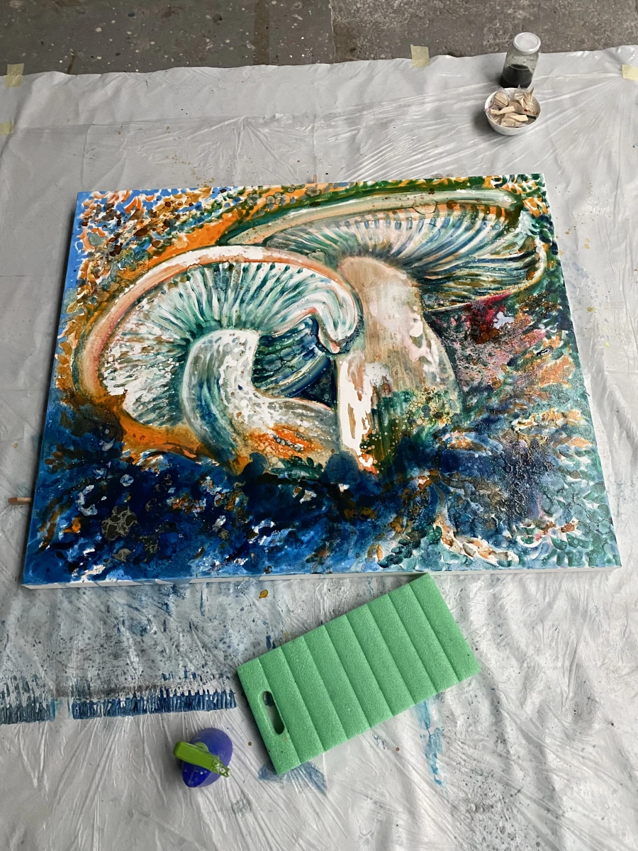 „Pilzpaar (Blutreizker)“ zeigt zwei leuchtende Blutreizker, die majestätisch aus einem lebendigen, vielfarbigen Waldboden emporragen. Die übergroßen Pilze dominieren die Komposition und erstrahlen in warmen Orange-, Rot- und Gelbtönen, die durch die kühl schimmernden, aquamarinblauen Lamellen kontrastiert werden. Ihr fleischiger, kräftiger Wuchs vermittelt Stärke und Lebendigkeit. Umgeben sind die Blutreizker von einem pulsierenden Geflecht aus Farnen und organisch anmutenden Partikeln, die den Eindruck eines atmenden, fruchtbaren Waldbodens erzeugen.