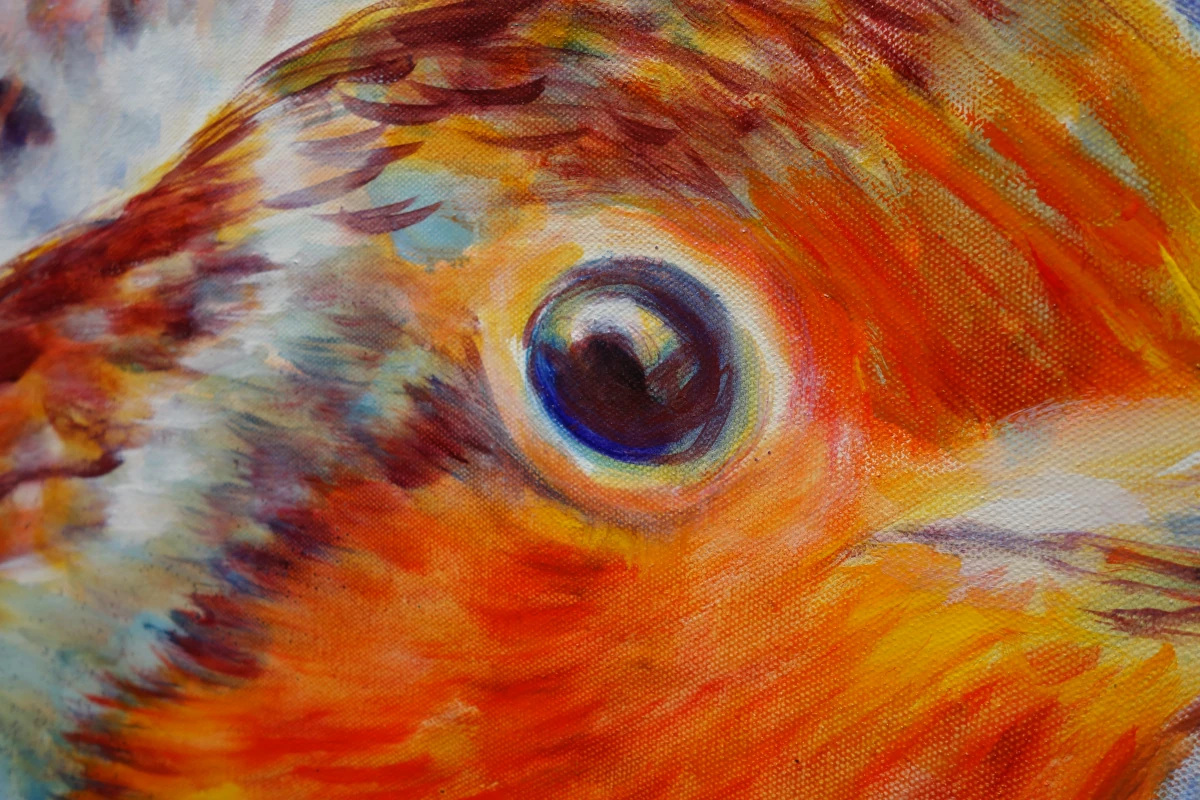 Das „Rotkehlchen auf Ast“ streckt sichtbar seine rote, herzförmige Brust hervor. Es thront auf einem knorrigen Ast vor einem farbintensiven Hintergrund. Die Farbpalette des Bildes – ein Zusammenspiel von warmen Orangetönen, tiefem Rot und kühlem Blau – erzeugt eine dynamische Spannung. Aquarellartige Farbverläufe erinnern an ein Morgenrot, das einen Übergang von Dunkelheit zu Licht andeutet.