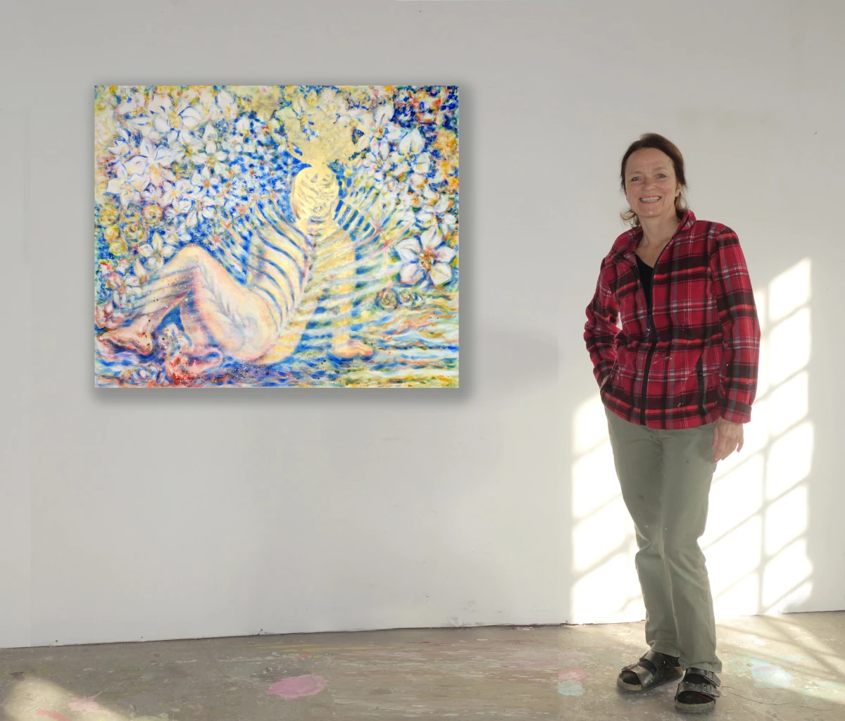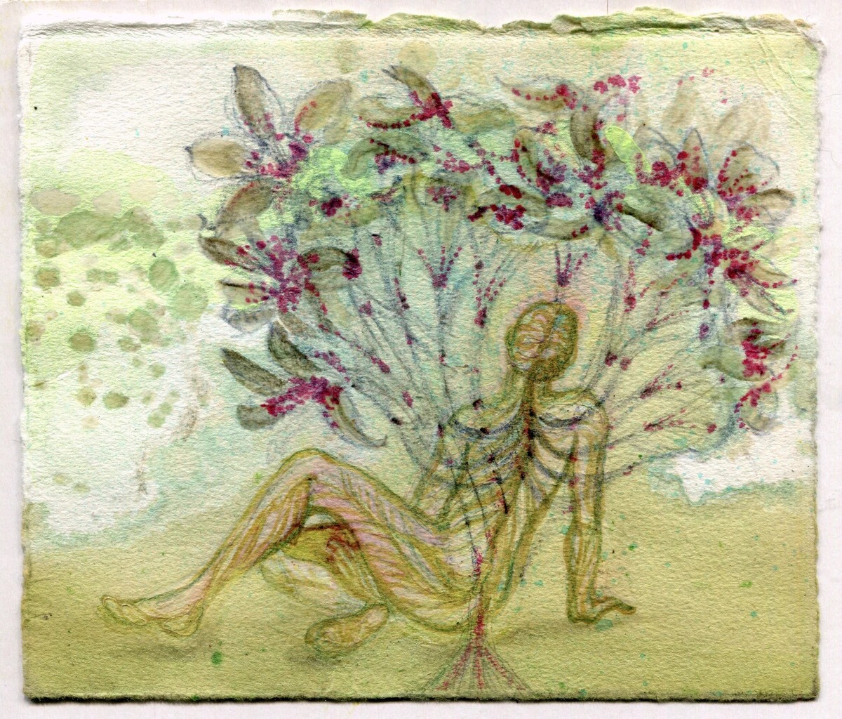 Dieses Gemälde entstand über drei Jahre hinweg, wobei es immer wieder neue Wendungen genommen hat. Von Beginn an (2022) wollte ich die menschliche Wirbelsäule in Analogie zu einem Baumblatt setzen, um die Verbindung zwischen Mensch und Natur zu verdeutlichen. Ich malte Linien, die aus der Wirbelsäule emporwachsen und sich organisch in Blütenstängel fortsetzen, die wiederum wie in einem Schutznetz um den Frauenkörper herum verknotet scheinen.