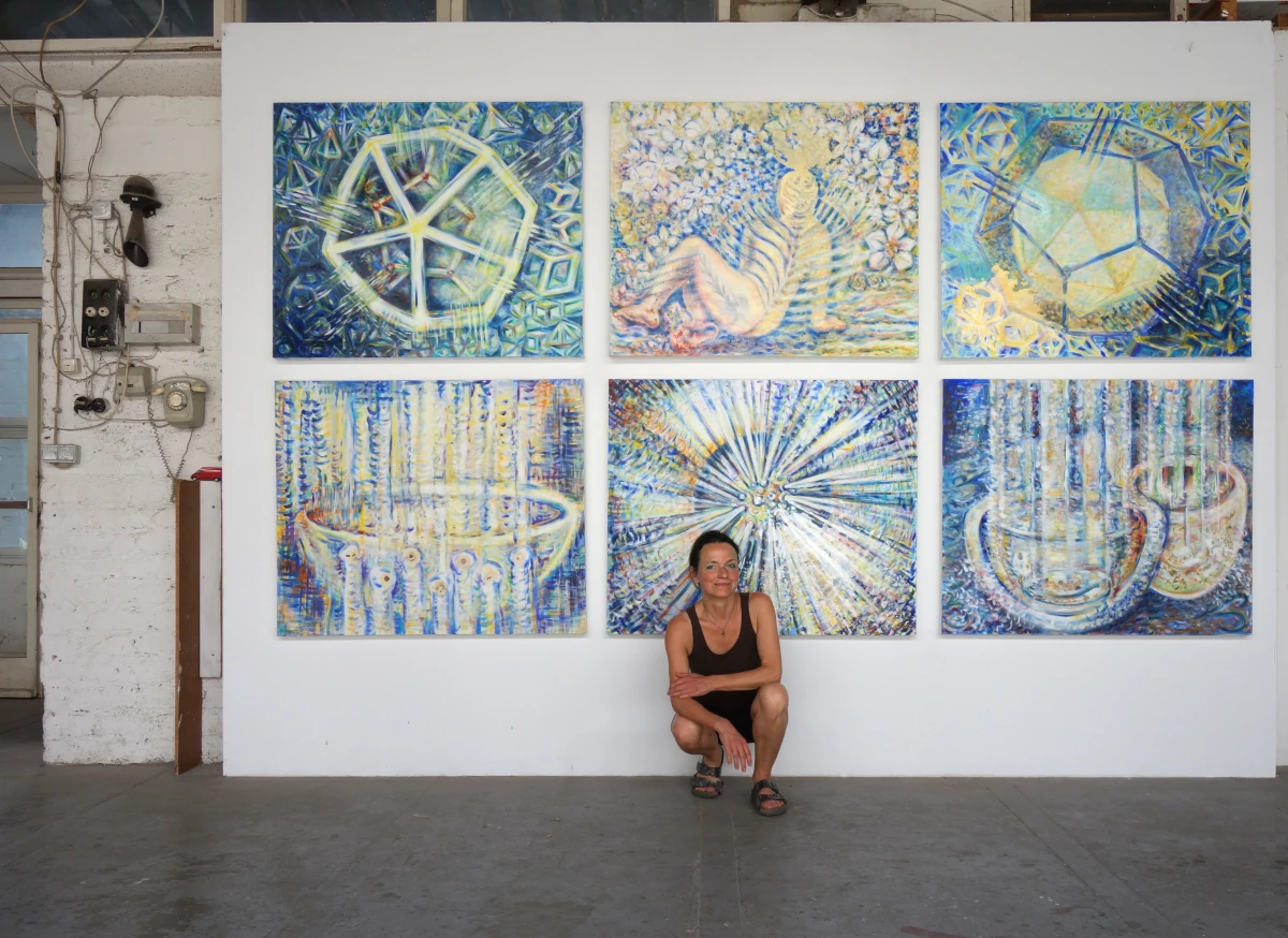 „Seltenes Aufblühen (Innere Orchidee)“ vereint die filigrane Schönheit der Natur mit der Anmut des Körpers einer Frau in einem nahezu überirdisch wirkenden Gemälde. Dominierende Blau-, Weiß- und Goldtöne verschmelzen zu einer atmosphärischen, fast ätherischen Szenerie. Der zentrale weibliche Rückenakt ist von einem Meer aus Orchideenblüten umgeben, die wie ein schützender Fächer in ihrer Wirbelsäule münden.