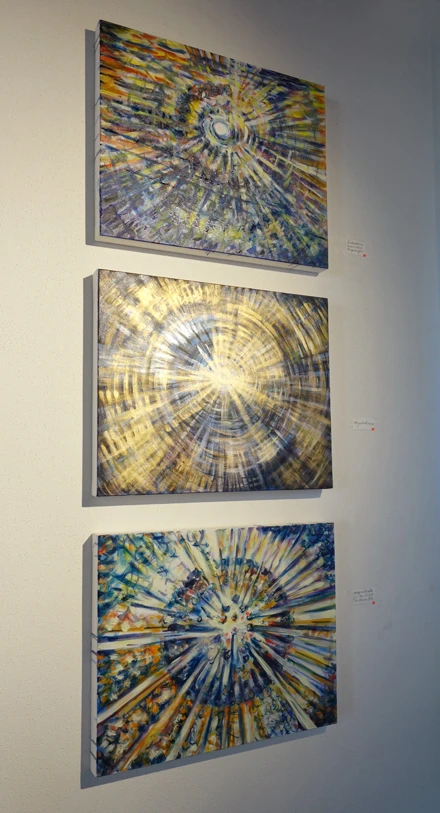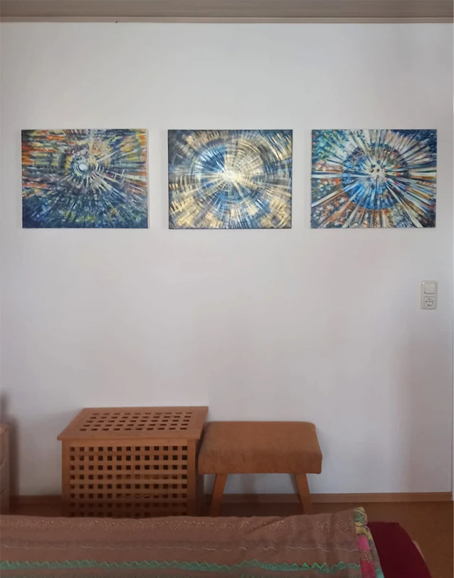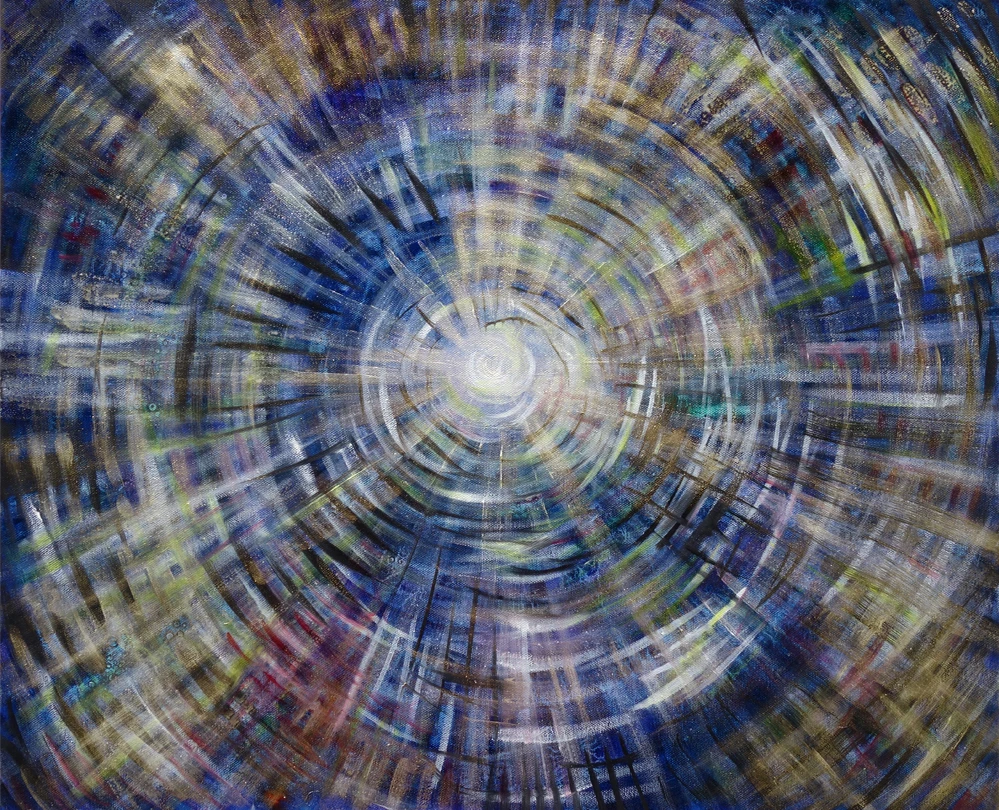 Ölfarbe, irisierende Acrylfarben, Walnuss-Sud, Glitter auf Leinwand