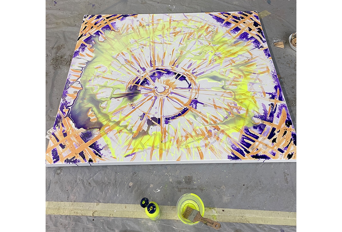 Original-Ölbild 100 x 120 x 4 cm, 2023, Ölfarbe, leuchtende Acrylfarbe, Schellack, Tusche auf Leinwand