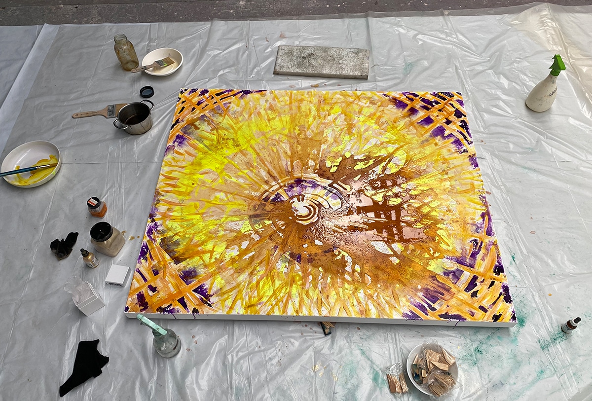 Das Gemälde SEELENFELD entstand, wie generell beim Malen, prozesshaft, intuitiv und im flow: Ich weiß in dem Moment einfach, was fehlt und welche Farben und Materialien ich nehmen muss. Das ist einerseits Erfahrung, anderseits Hingabe an die Führung der göttlichen Quelle.