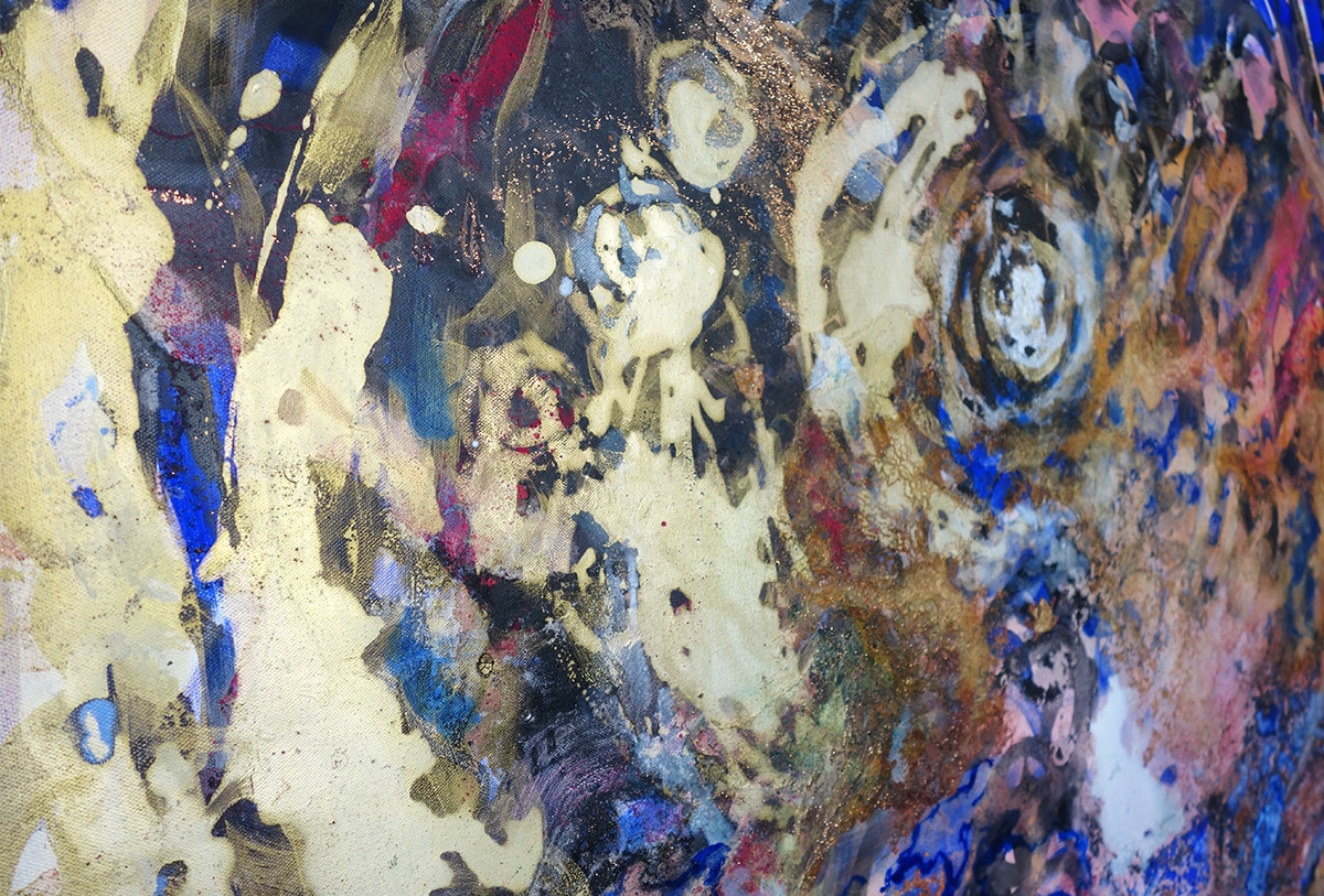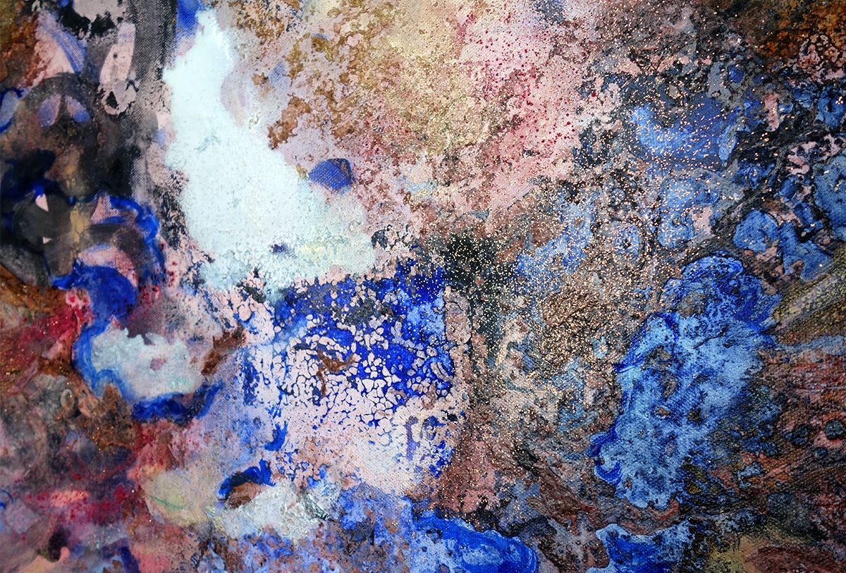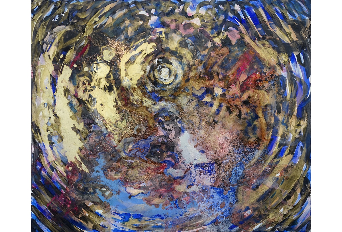Original-Ölbild 100 x 120 x 4 cm, 2023, Ölfarbe, irisierende Acrylfarbe, Schellack, Walnuss-Sud, Glitter auf Leinwand