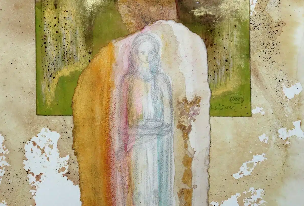 Collage mit Graphitstift, Aquarellstift, lasierende Ölfarbe, Schelllack, Pigmente, Goldpuder auf mit Tee und Zwiebelsud präpariertem Büttenpapier_53 x 40 cm, 2022