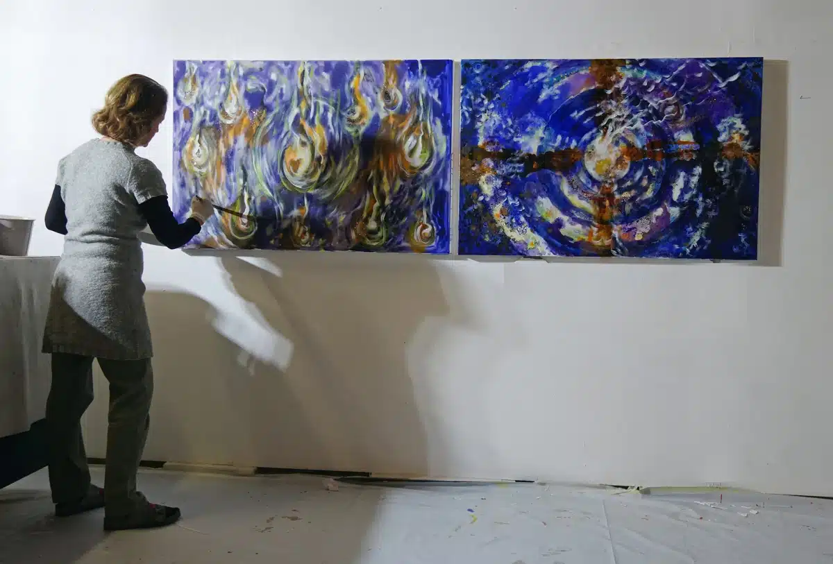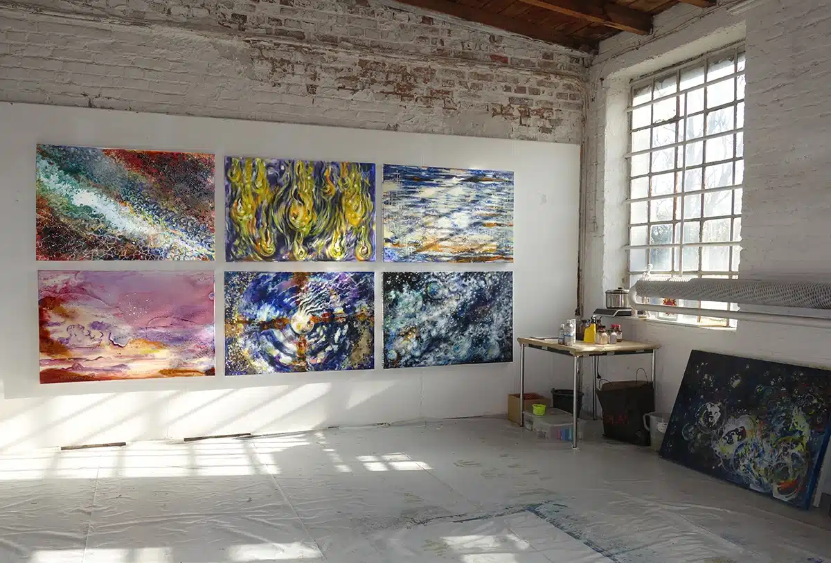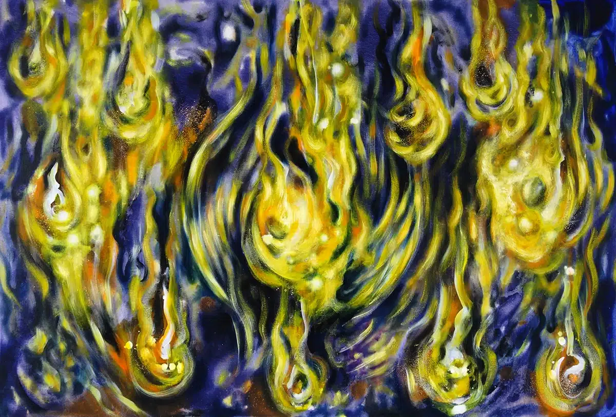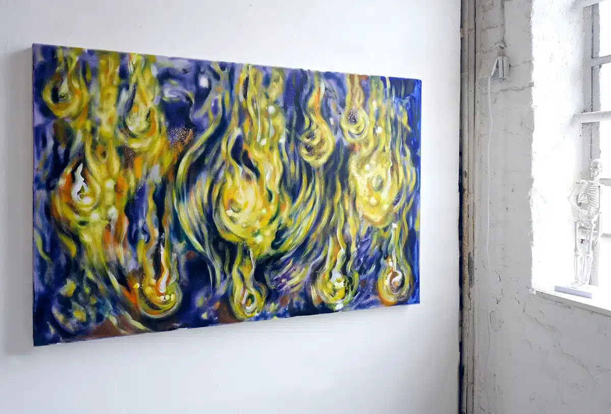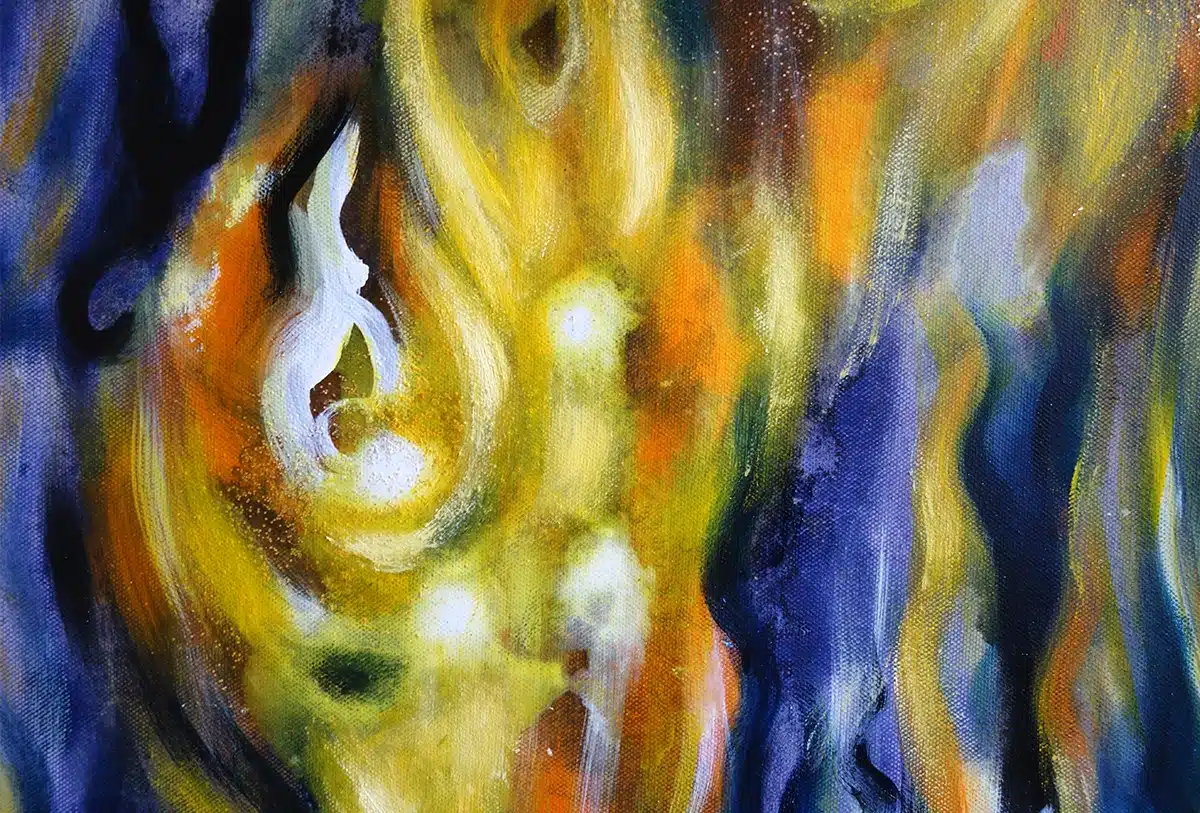 Ölfarbe, Schellack, Walnuss-Sud, Glitter auf Leinwand
