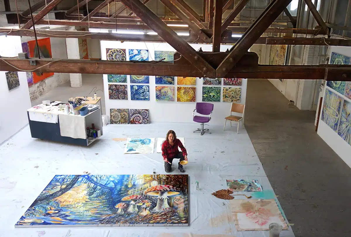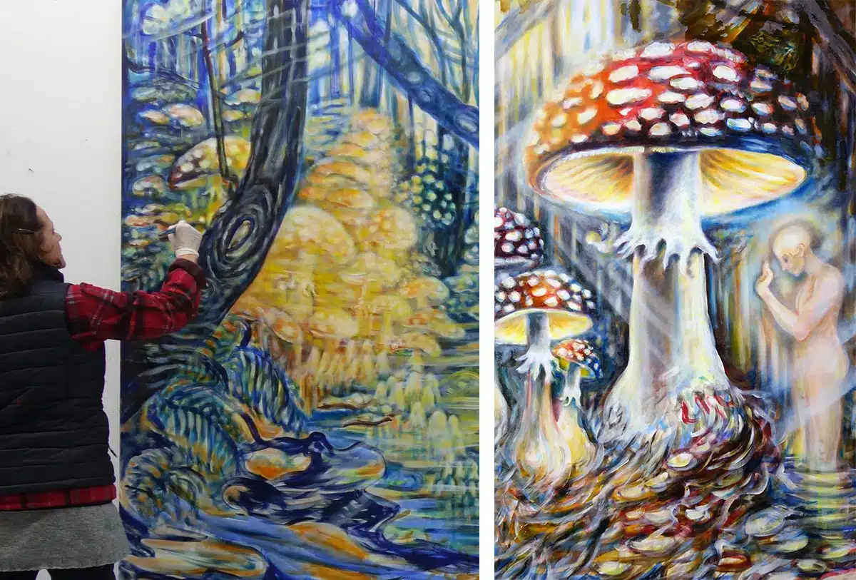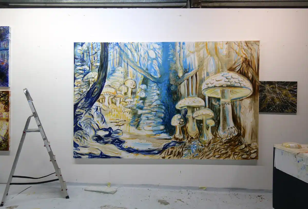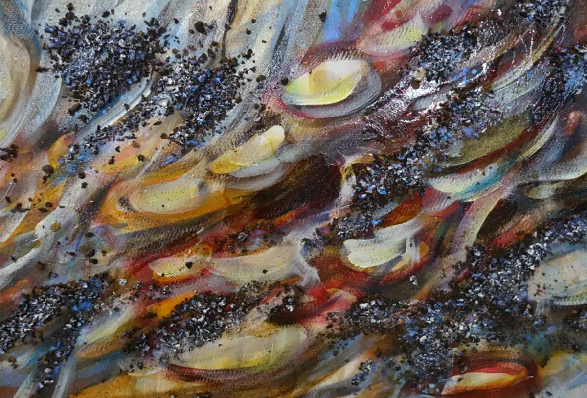 Ölfarbe, Glitter, Schellack, Walnussschalen zerkleinert auf Leinwand