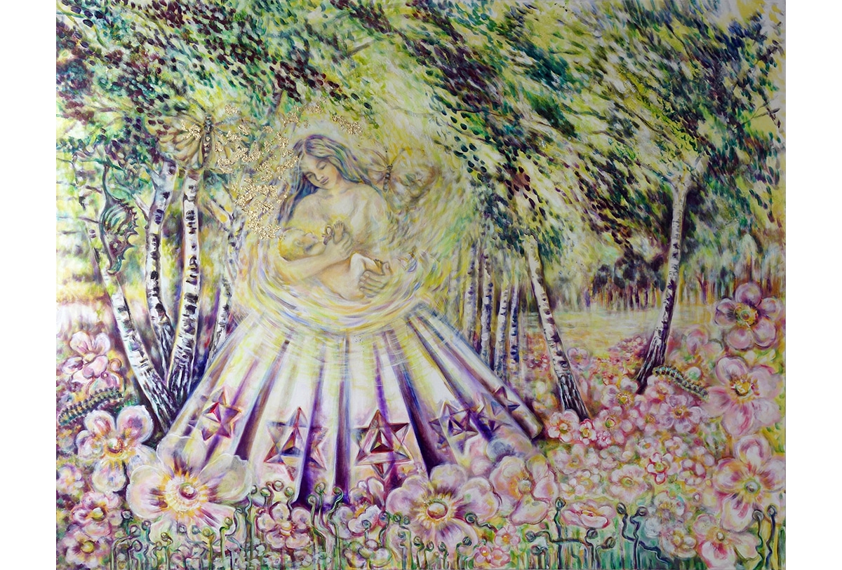 In silbrig-grünem Farbflimmern stehen Mutter und Kind in einem Strahlenfeld, mit einer Blattgold-Aura, die sich in ihrem ausgebreiteten Rock fortsetzt – wie eine geöffnete Blüte oder ein kosmisches Kleid aus Licht. In dieses Gewand habe ich das altägyptische Symbol der MERKABA hineingemalt. Merkaba bedeutet Himmelswagen. Damit ist gemeint, dass unser kristalliner Lichtkörper Kontakt zu höheren Dimensionen aufnehmen kann. Und gleichzeitig ist es ein Symbol, das die Polarität von Männlich und Weiblich vereint. Das Dreieck nach oben steht für das aufstrebend, aktiv-männliche Prinzip – das Dreieck nach unten symbolisiert das Empfangende-Weibliche. In der Merkaba kommen diese Pole zu einer Einheit.