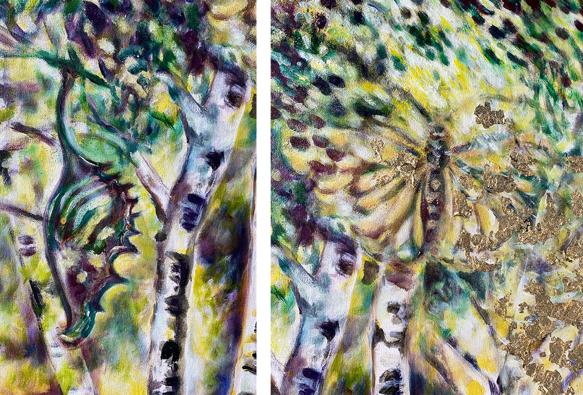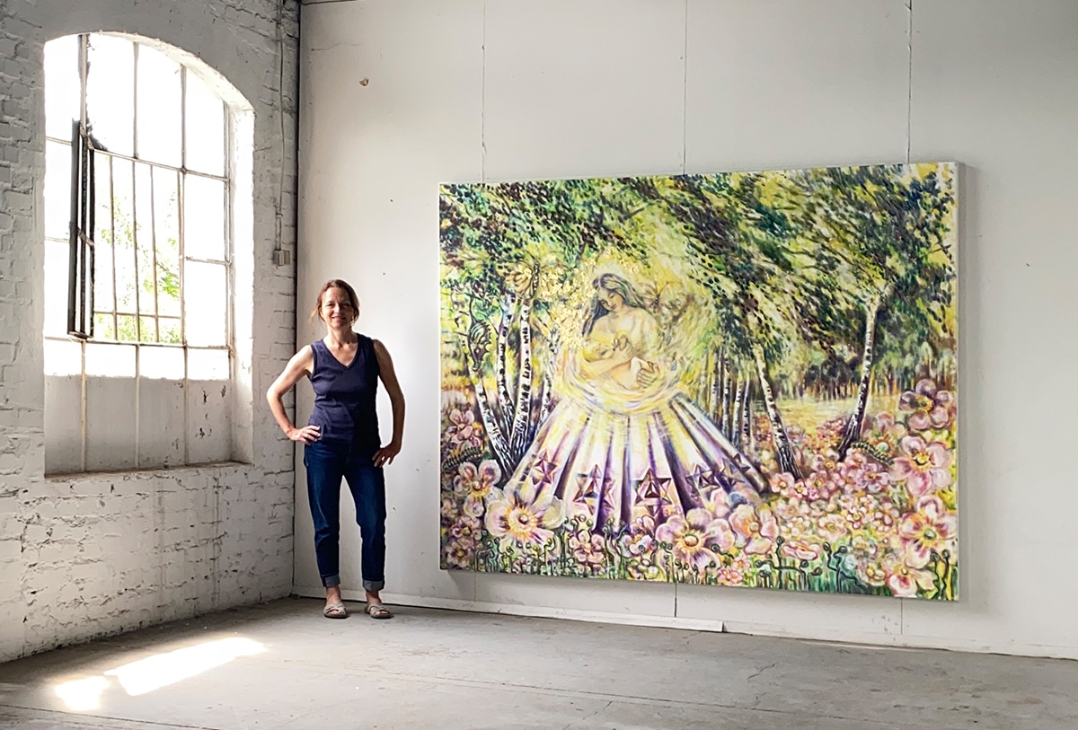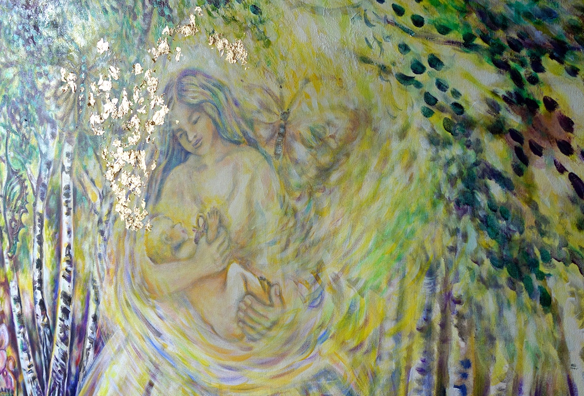 Das Bild zeigt eine Szene einer Mutter mit Kind, angelehnt an den Archetyp Maria und das Jesuskind. Es findet in einem Birkenhain statt, weil in meinem Geburtshaus im Ruhrgebiet hinten in dem kleinen Garten Birken standen, an die ich mich heute noch erinnern kann.