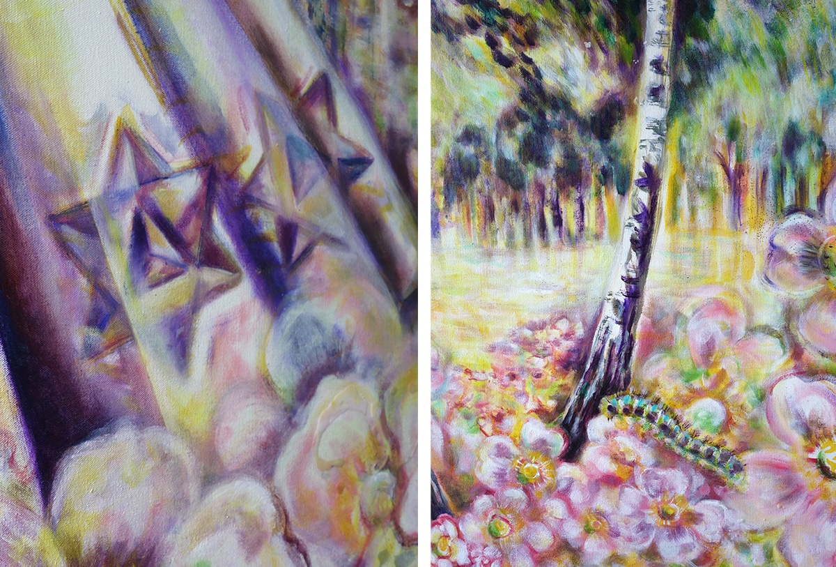 Mutter und Kind stehen in einem Meer von rosa-roten Anemonen. Rechts im Hintergrund habe ich eine Art Lichtgewässer oder Wiese gemalt zwischen den vom Wind bewegten Birken. Anemone bedeutet im Griechischen wörtlich „Tochter des Windes“. Im Deutschen daher bekannt als „Windröschen“. Anemonen werden oft als Frühlingsboten wahrgenommen und symbolisieren den Beginn neuer Dinge, Vorfreude und Hoffnung. Aber sie stehen auch für Vergänglichkeit – also auch hier wieder das Gesetz der Polarität. In der griechischen Mythologie entspringt die „Windblume“ nämlich den Tränen von Aphrodite, als sie um den Tod von Adonis trauert.