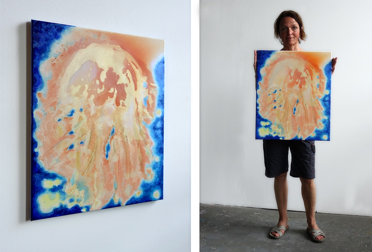 In meinem Werk LEUCHTQUALLE (ORANGE) erscheint die Qualle weniger als Meerestier denn als Lichtwesen. Ihr Leuchten entsteht nicht durch äußere Beleuchtung, sondern kommt von Innen – ein Sinnbild für eine innere, leuchtende Präsenz in uns allen, die jedoch erst durch Reifung entsteht, durch Bewusstwerdung oder wie C. G. Jung es formuliert: durch Individuation.