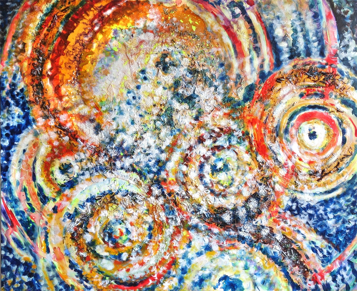 Das Werk „Lichtzellen“ zeigt runde, pulsierende Felder in den Farben Weiß, Gelb, Orange und Rot. Sie durchdringen den blauen Hintergrund in kreisender, fließender Bewegung. Im oberen, mittleren Bildraum flirrt ein Quellbereich kosmischer Aktivität, aus dessen Mittelpunkt weiße Lichtpunkte über die ganze Leinwand strömen. Rote Tuschelinien und mit Gummiarabicum aufgeklebte Blauholzspäne und zerkleinerte Wallnussschalen erzeugen eine dreidimensionale Textur und erinnern an molekulare Bewegungen oder Sternenstaub. Dynamische Farbverläufe lassen das Bild lebendig und durchlässig wirken – als würde es selbst vibrieren.