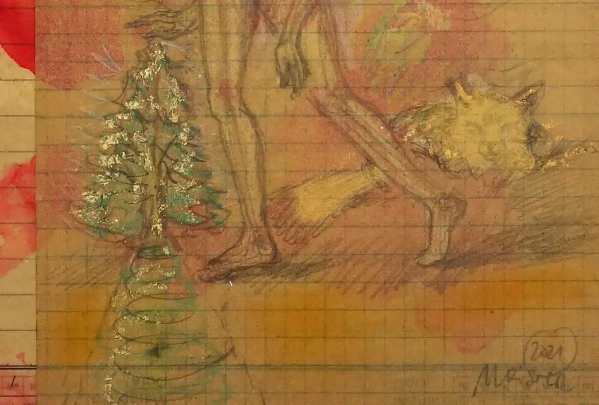 Original-Zeichnung 25,5 x 19 cm, 2021, Graphitsift, Aquarellstift, irisierender Ölkreide, geklebt auf mit Leinöl und Pigmenten präpariertem altem Schulheftpapier