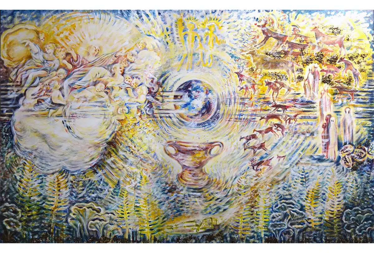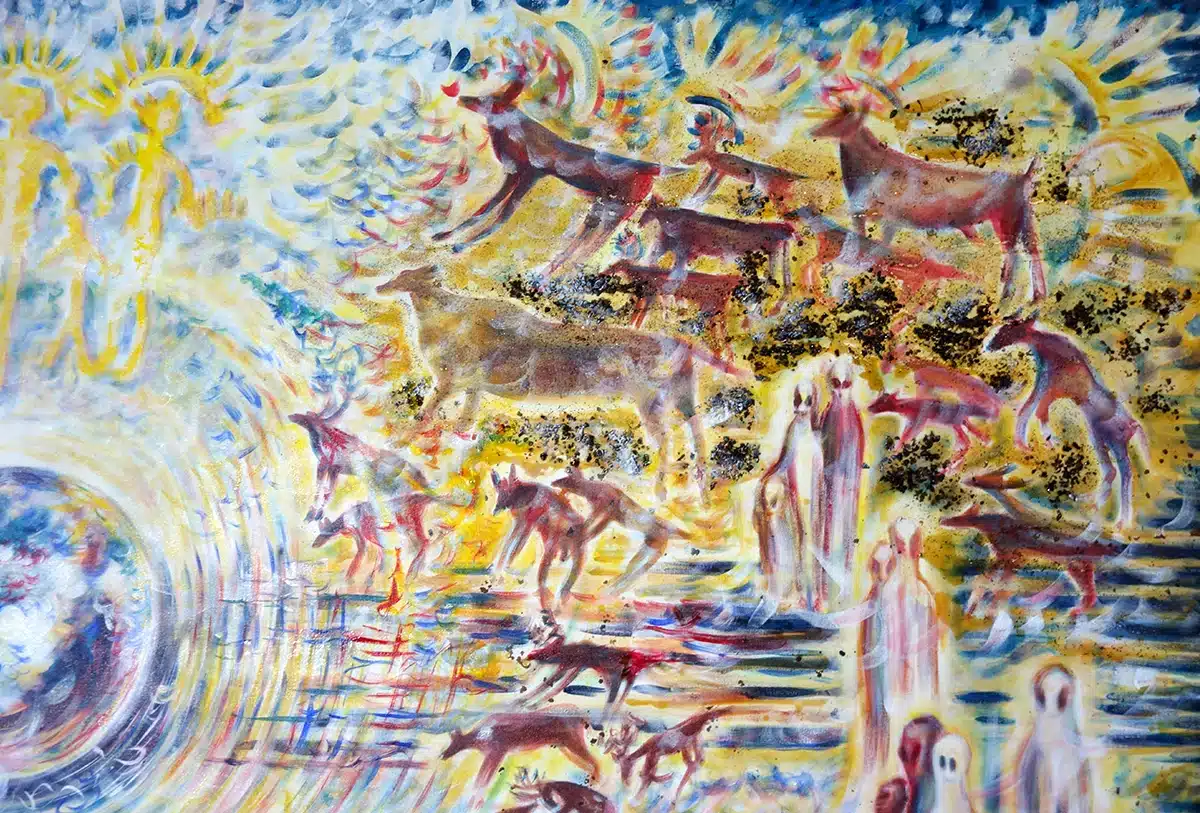 Ölfarbe, Glitter, Schellack, Walnussschalen zerkleinert auf Leinwand, 2023
