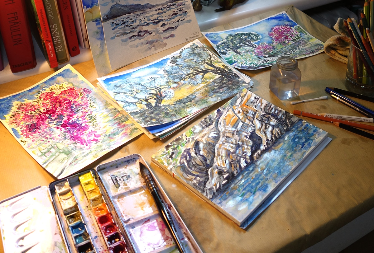 Denke an deine eigenen Reisen und hole dir mit einem kleinen Aquarell das Funkeln der Sonnenstrahlen auf dem Meer, die Wolkenformationen am Morgenhimmel, den Geruch von Pinien und Oleander und das Gefühl von Sommer, Freiheit und Leichtigkeit direkt in dein Zuhause.