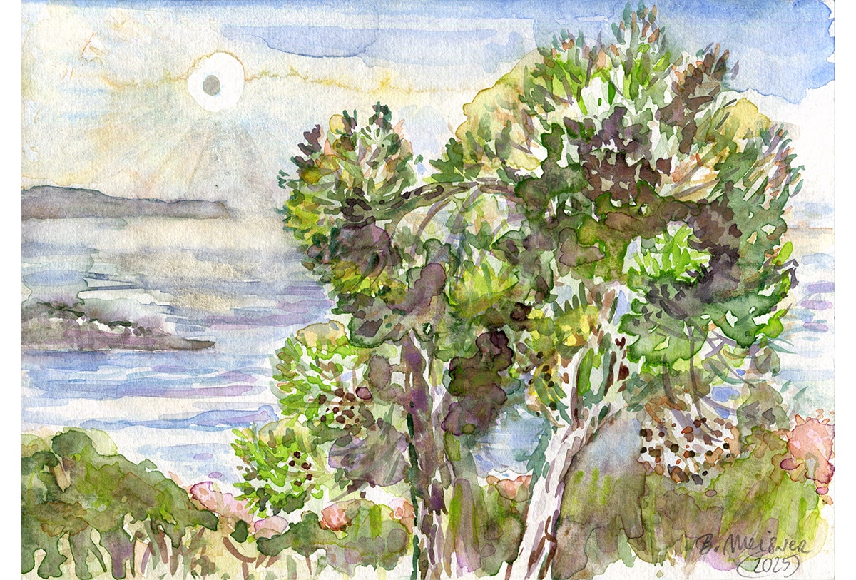Magst du den Duft von Pinien? Während die anderen Schwimmer womöglich noch schliefen, stand die schwimmende yellow cap Künstlerin auf dem Plateau hinter unserer Pension und aquarellierte MAGIC PINE TREES während sie das wundervolle Schauspiel der aufgehenden Sonne genoss! Der frühe Vogel fängt die Aprikose!