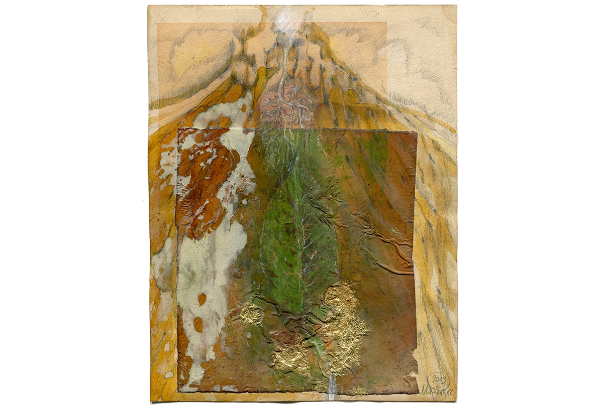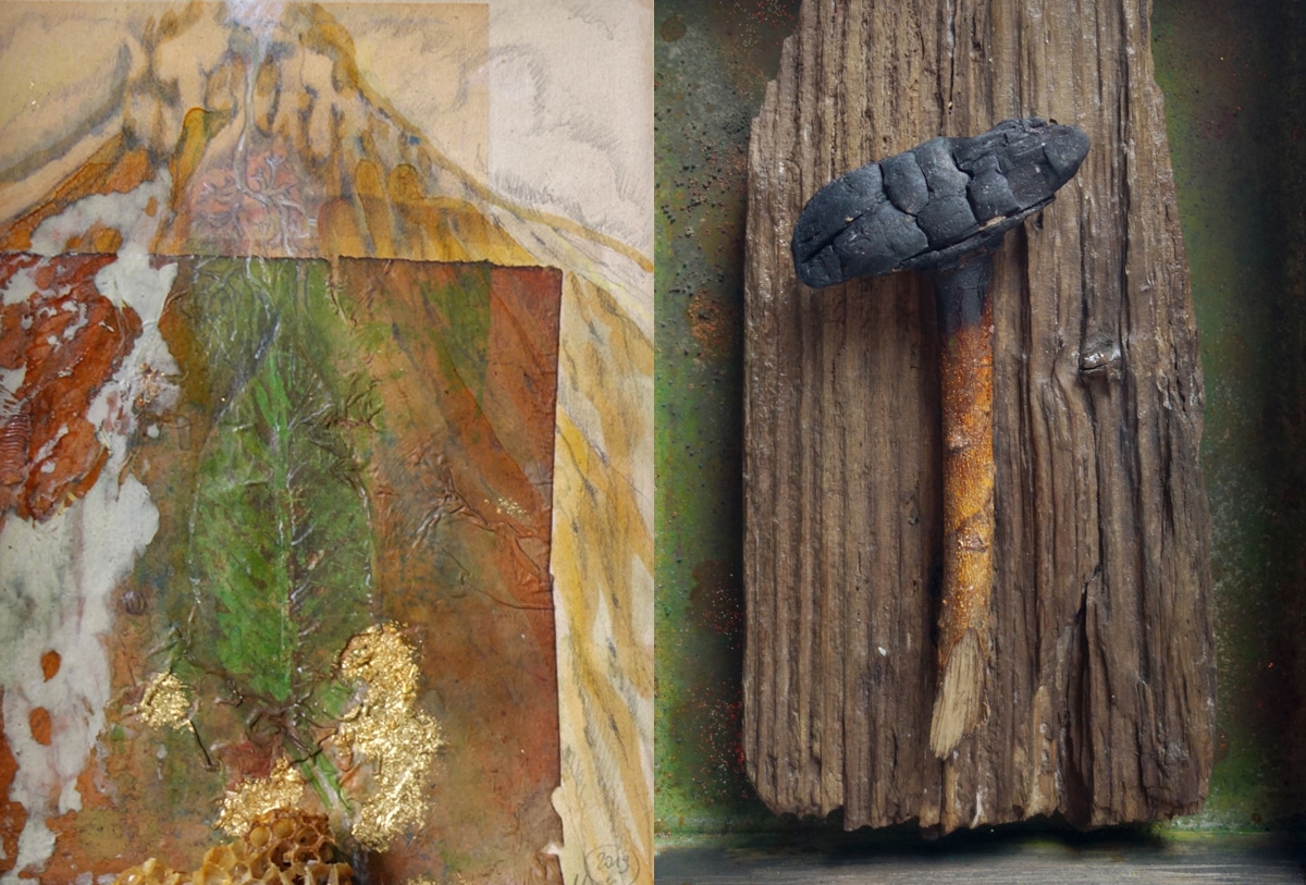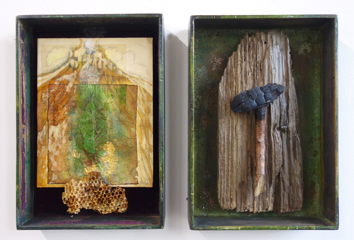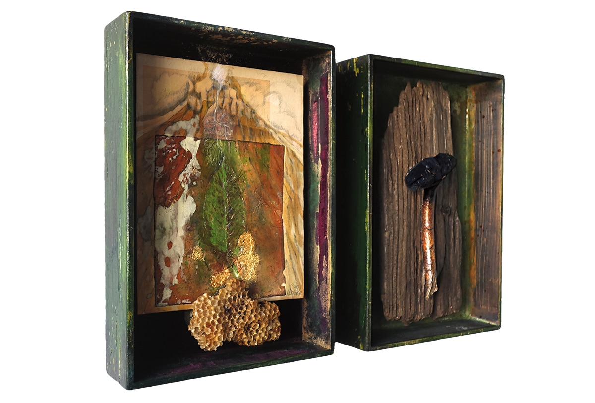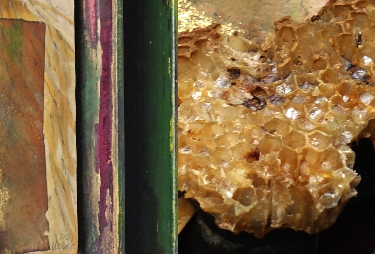 Zwei handgefertigte Modellrahmen aus Holz, farblich bearbeitet und teilweise mit Samt beklebt + Bienenwabe und Holzfundstück vom Rheinufer Düsseldorf + Collage 20 x 25,7 cm, 2018, Graphitstift, Farbstift, Acrylfarbe, Schellack, Blatt von einem Baum, Blattgold auf präpariertem Papier