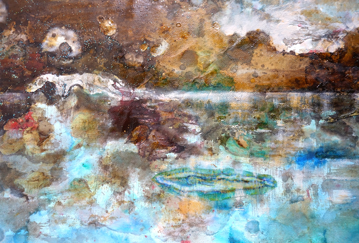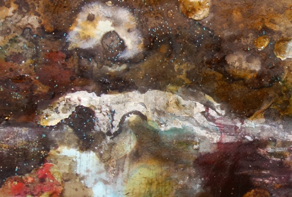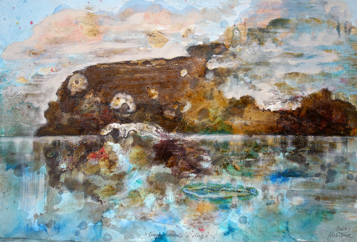 Original-Collage 53 x 78 cm, 2024, Ölfarbe, Schellack, Walnuss-Sud, Pigmente, Glimmer auf Büttenpapier, collagiert mit auf Transparentpapier gedruckter Schwimmerin