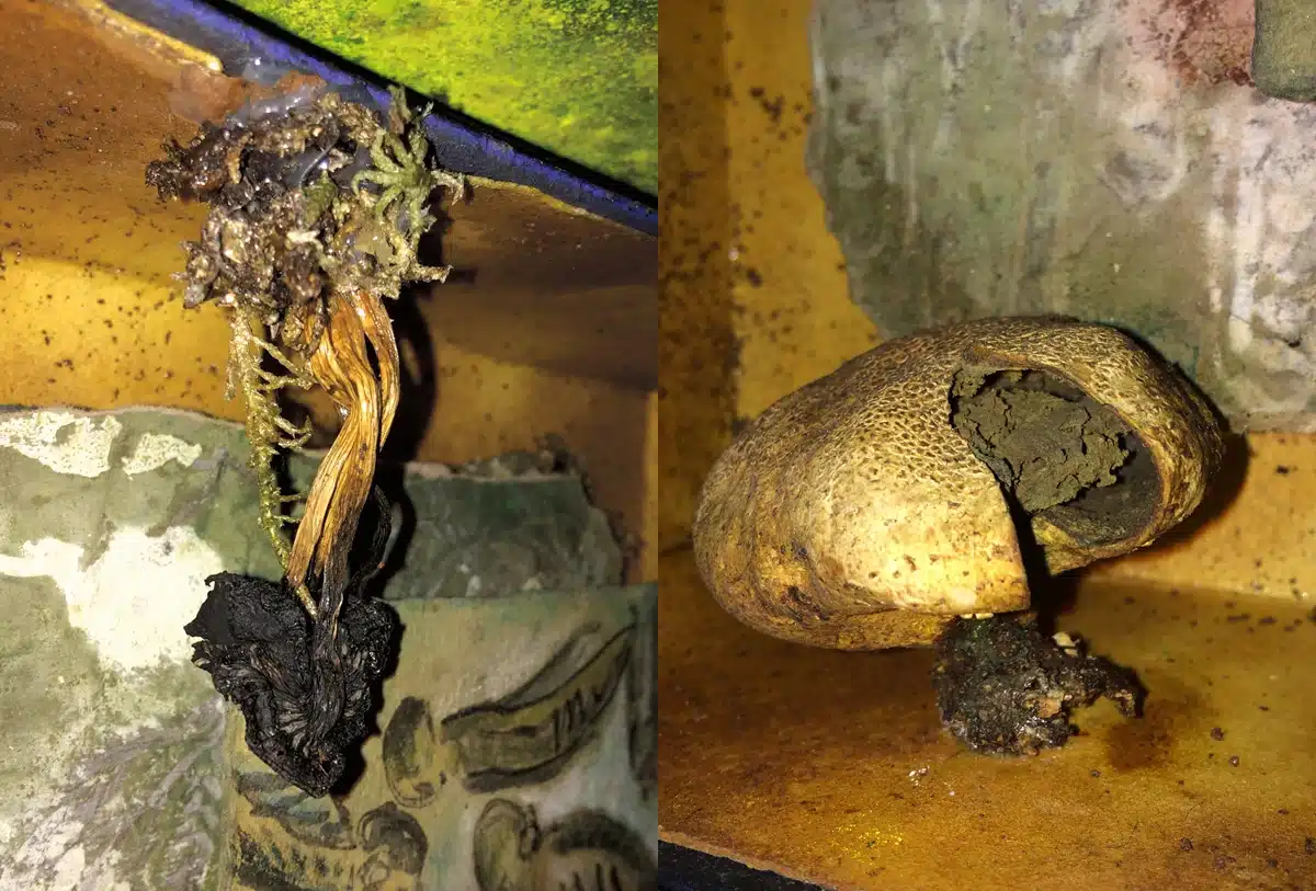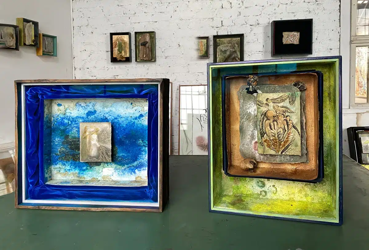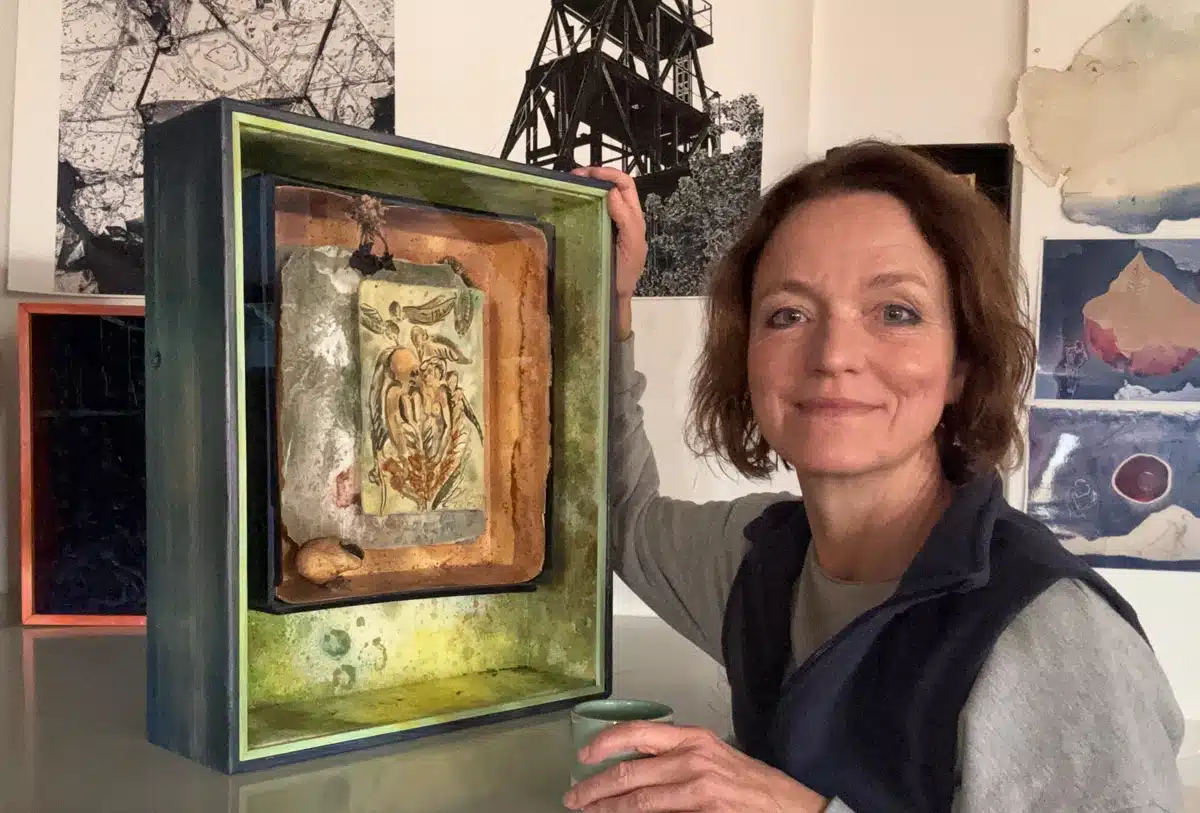 Handgefertigter Bildraum aus Holz + Museumskarton + Zeichnung (20 x 13,5 cm von 2017 mit Tusche und Schellack) auf präpariertem Papier + geleimten Waldpilzen, insgesamt 48,5 x 40 x 12 cm, 2021