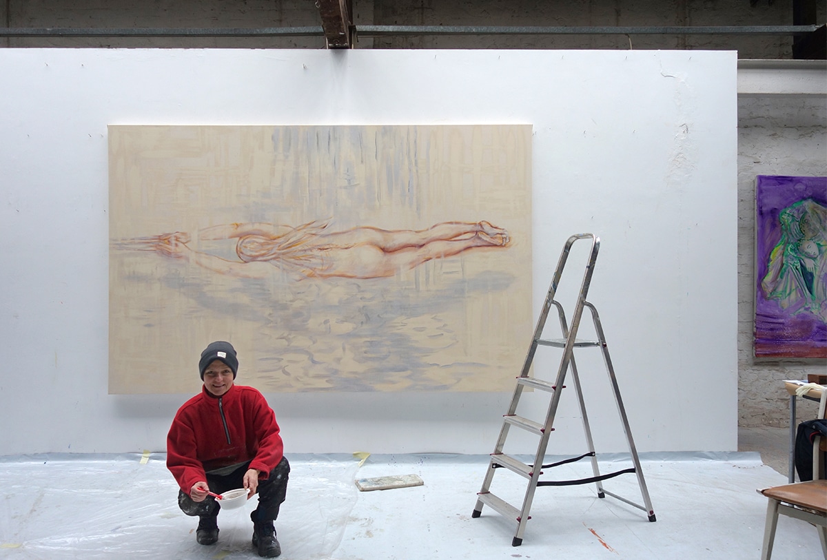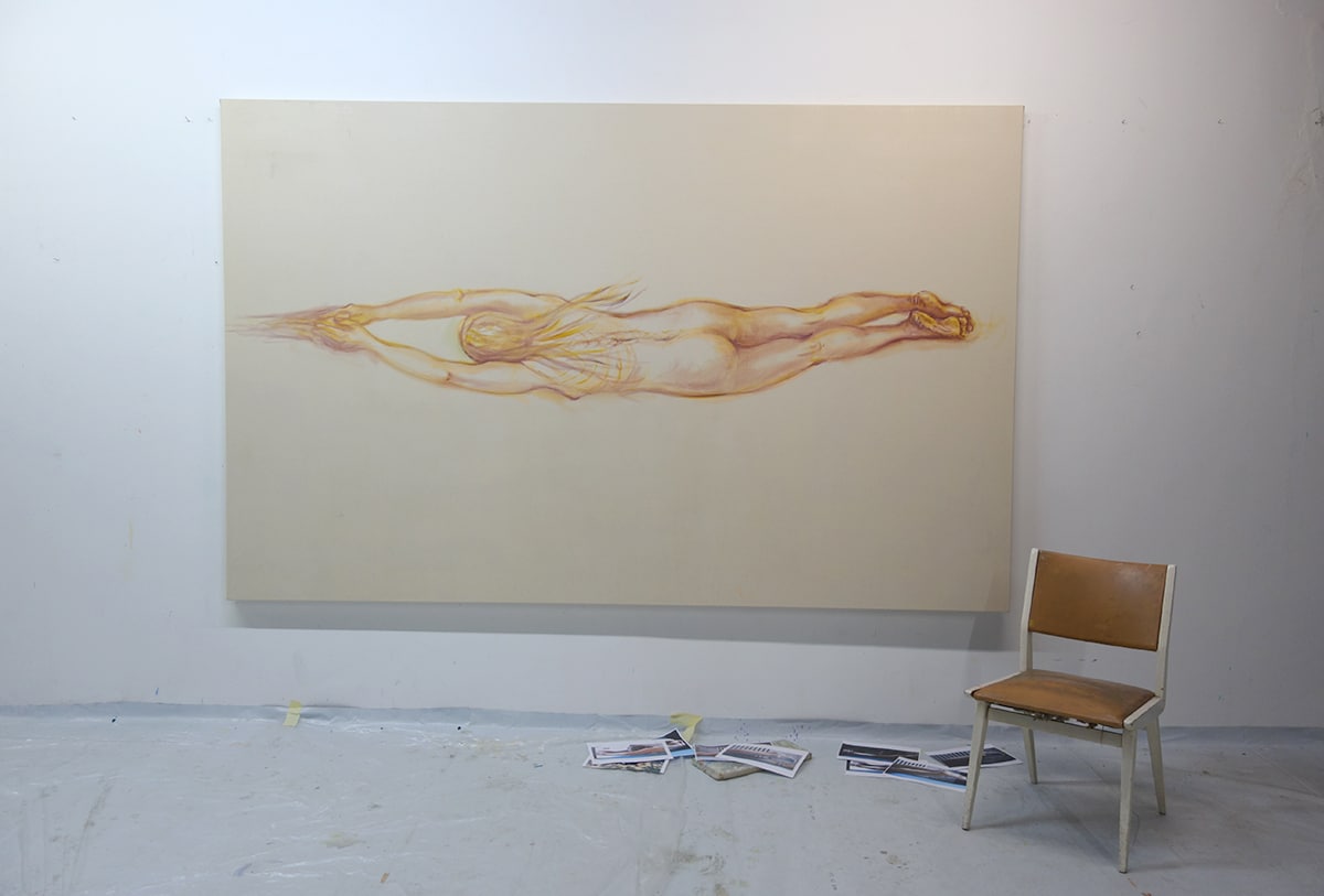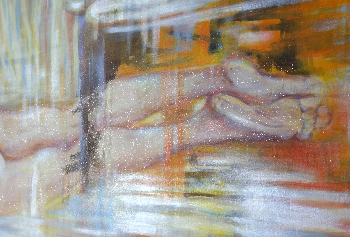 Die Hingabe, die vollkommene Versunkenheit des Aktes ist sofort spürbar. Weil der Raum so abstrakt – so eindeutig ‚Malerei‘ und so wenig ‚Welt‘ ist – ist es aber auch für Nicht-Eingeweihte begreiflich, dass wir im Bereich des Allegorischen sind und nicht irgendeinem trivialen Badespass beiwohnen.