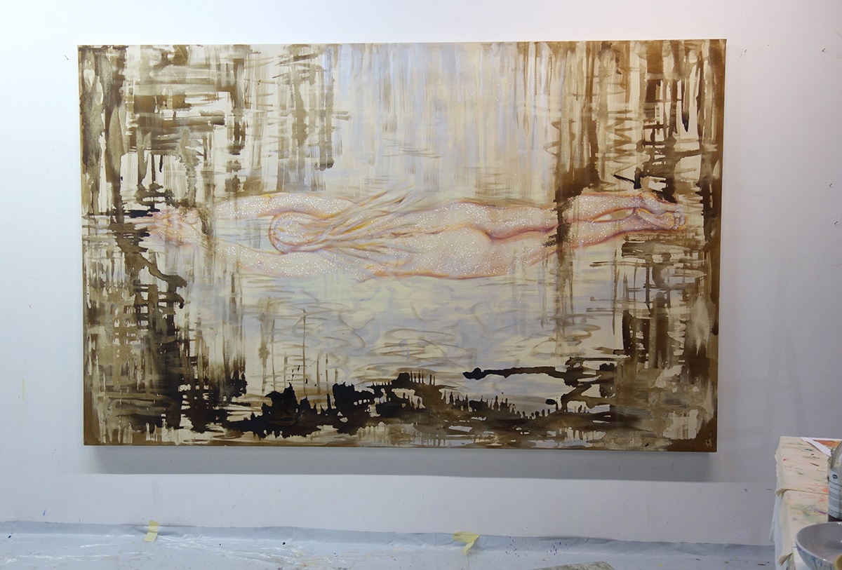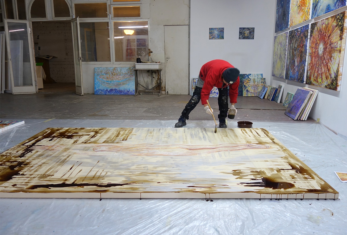Original-Ölbild 190 x 300 x 4,5 cm, 2023, Ölfarbe, irisierende Acrylfarbe, Walnuss-Sud, Glitter auf Leinwand