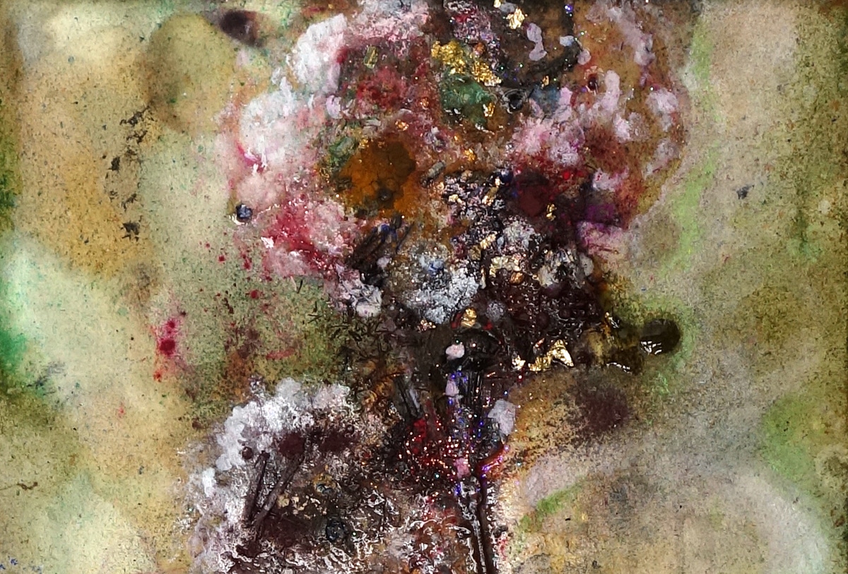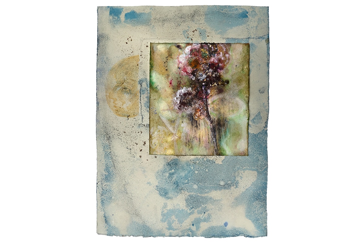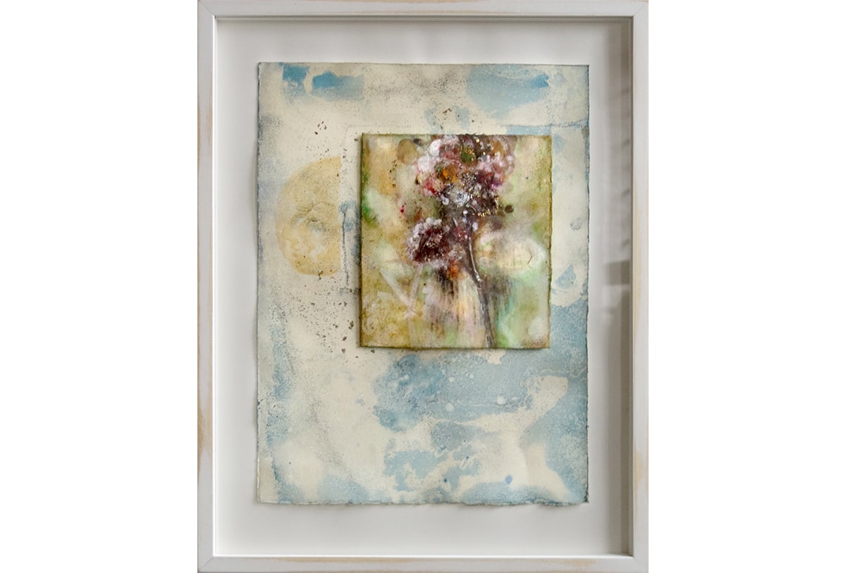 Original-Collage 53 x 40 cm, 2022, Acrylfarbe, Silberfarbe, Pigmenten, Schellack auf getrockneter Blüte auf präpariertem Büttenpapier