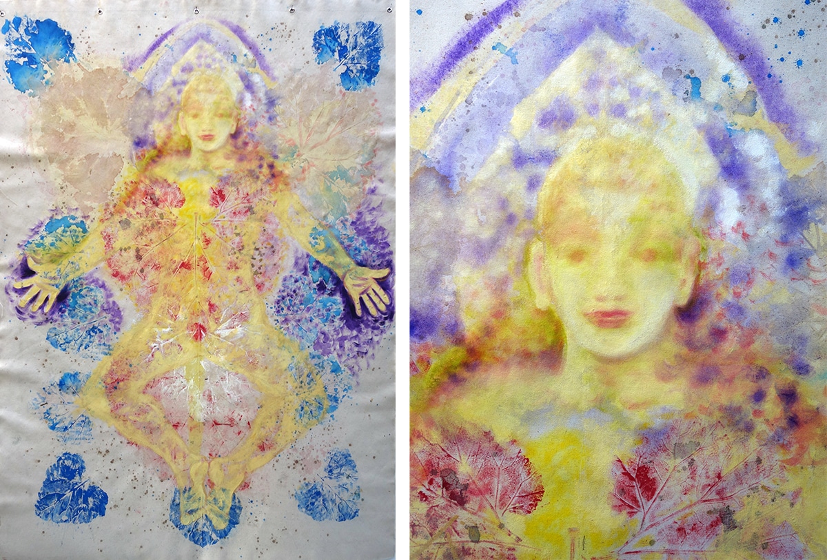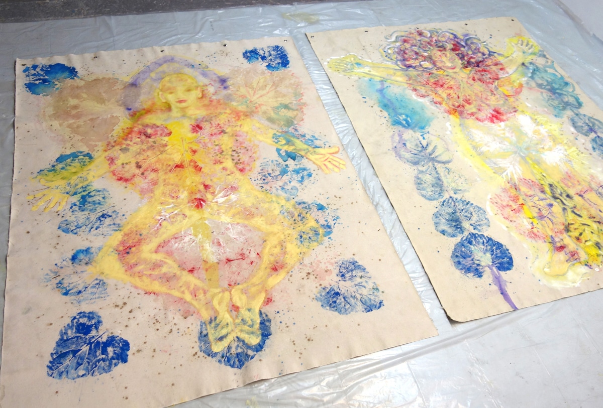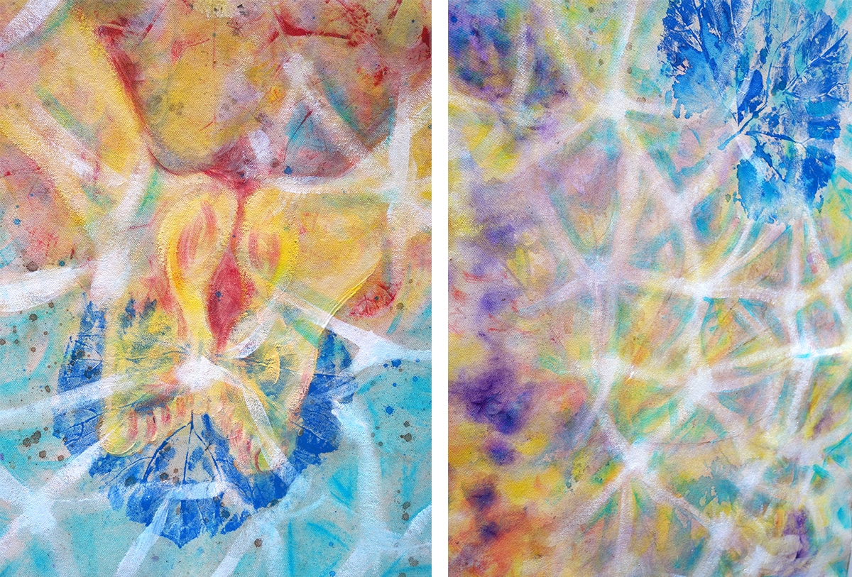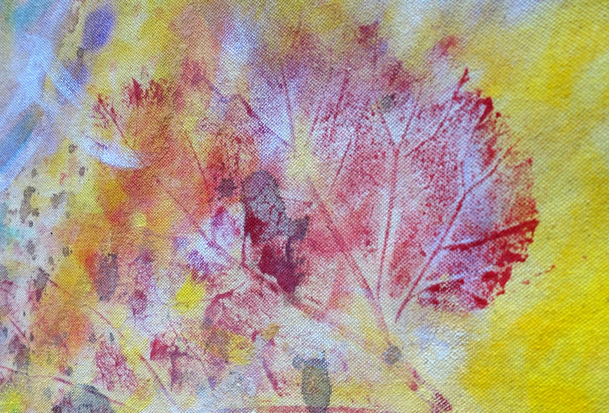 Original-Ölbild 210 x 155 cm, 2023, Ölfarbe, Acrylfarbe, Gummiarabicum, Schellack, Pflanzenblätter aufgeklebt, Abdrücke von Pflanzenblättern, Glimmer auf Leinwand (mit Ösen zum Hängen – ohne Keilrahmen)