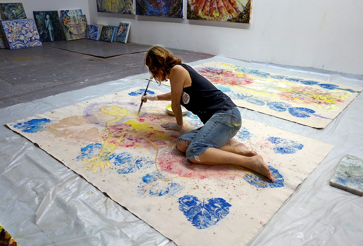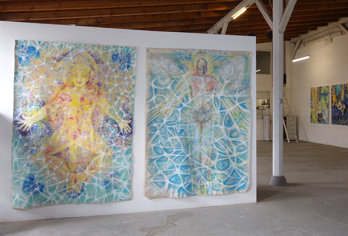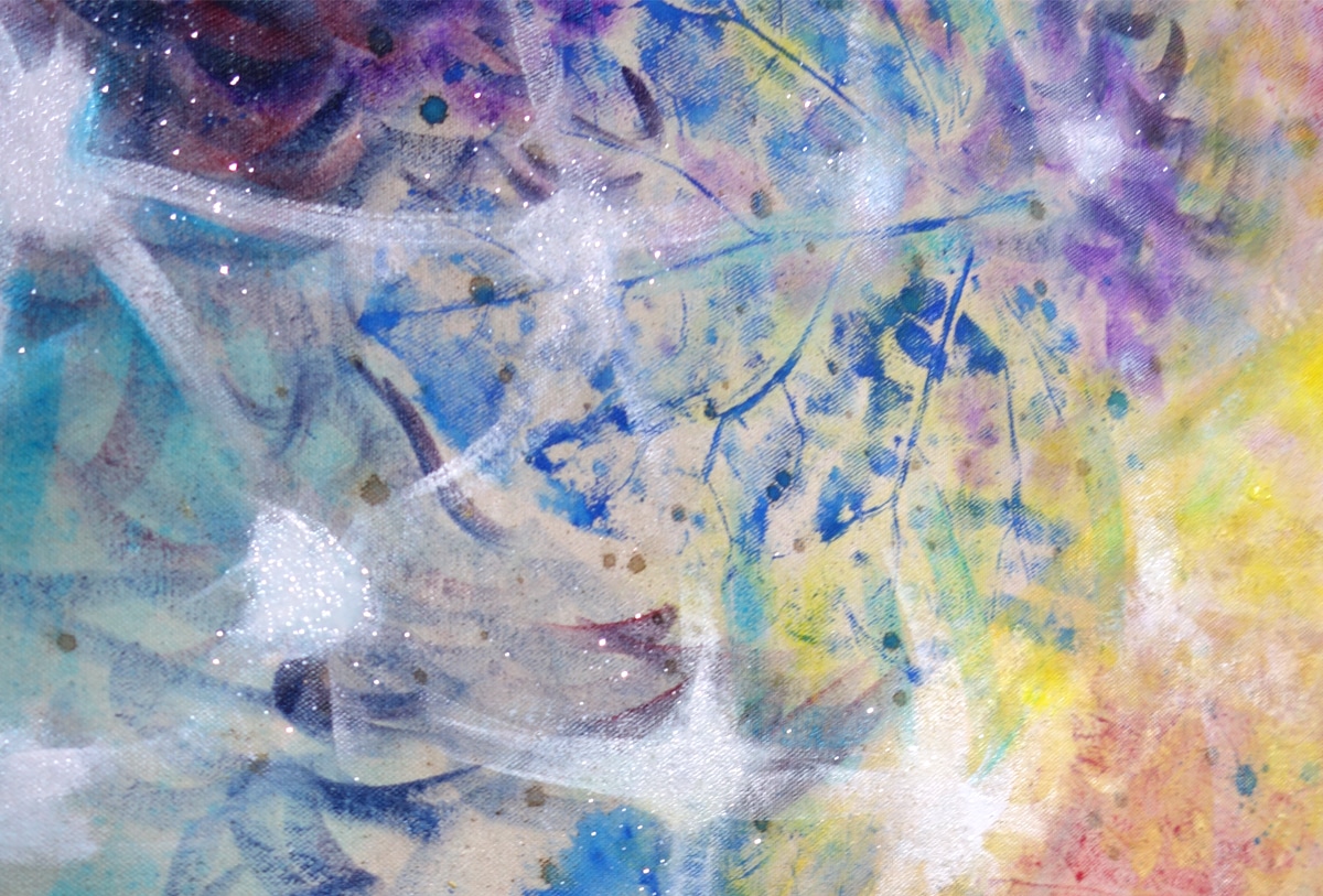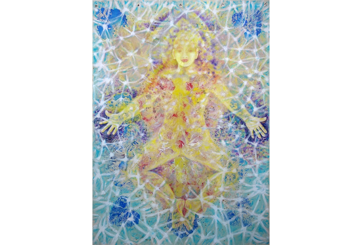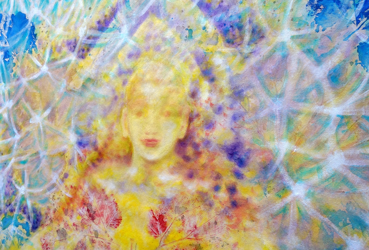 Original-Ölbild 210 x 155 cm, 2023, Ölfarbe, Acrylfarbe, Gummiarabicum, Schellack, Pflanzenblätter aufgeklebt, Abdrücke von Pflanzenblättern, Glimmer auf Leinwand (mit Ösen zum Hängen – ohne Keilrahmen)