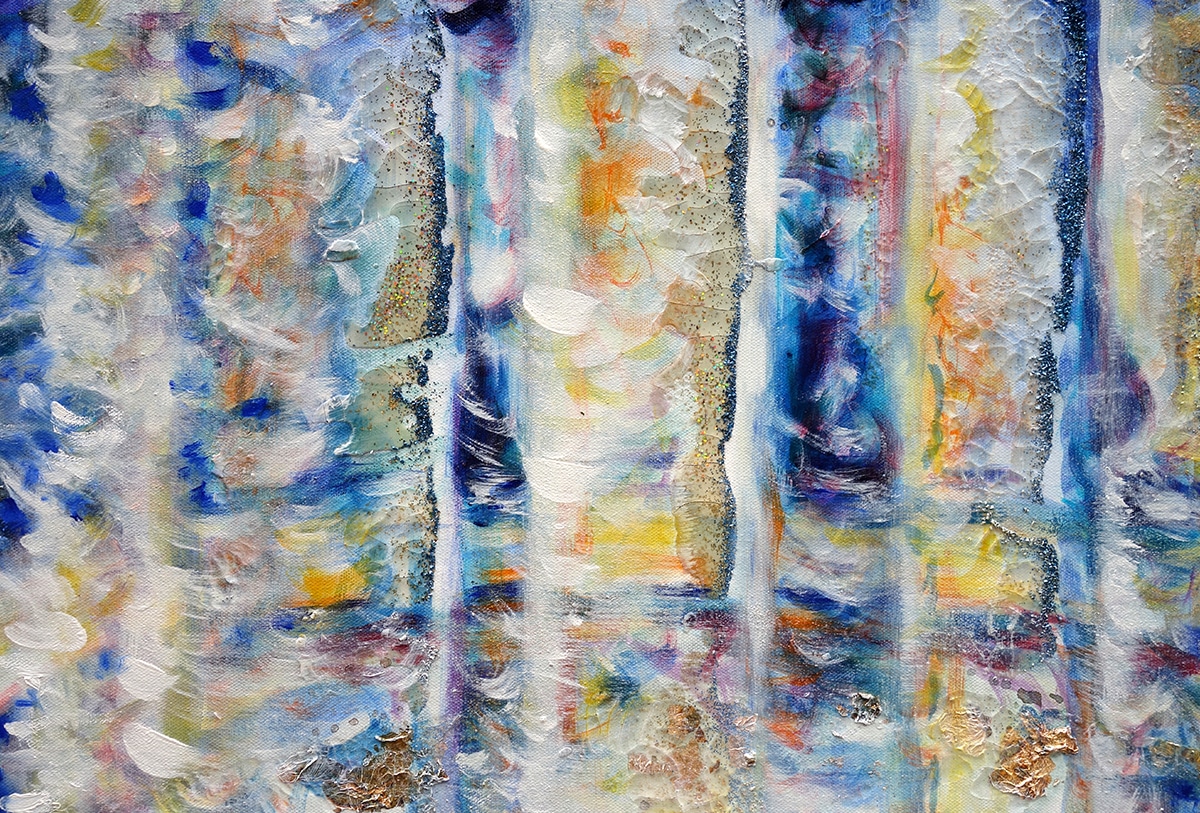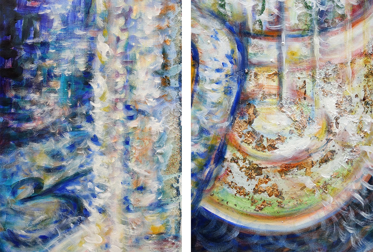 Die Schalen entstanden Schicht für Schicht, mit lockeren Pinselstrichen und meinem intuitiven Gespür für Farbe und Form. Als Metapher für das Geistige habe ich Blattgold in verschiedenen Farbnuancen – Gold, Silber und Kupfer – eingearbeitet.