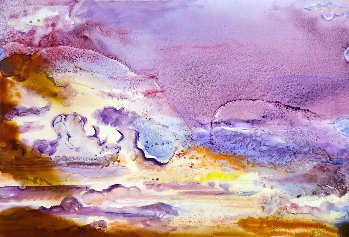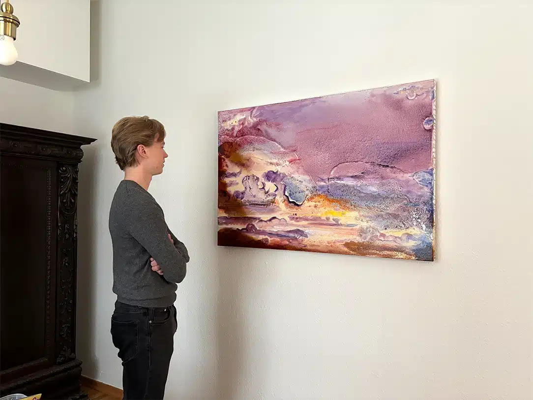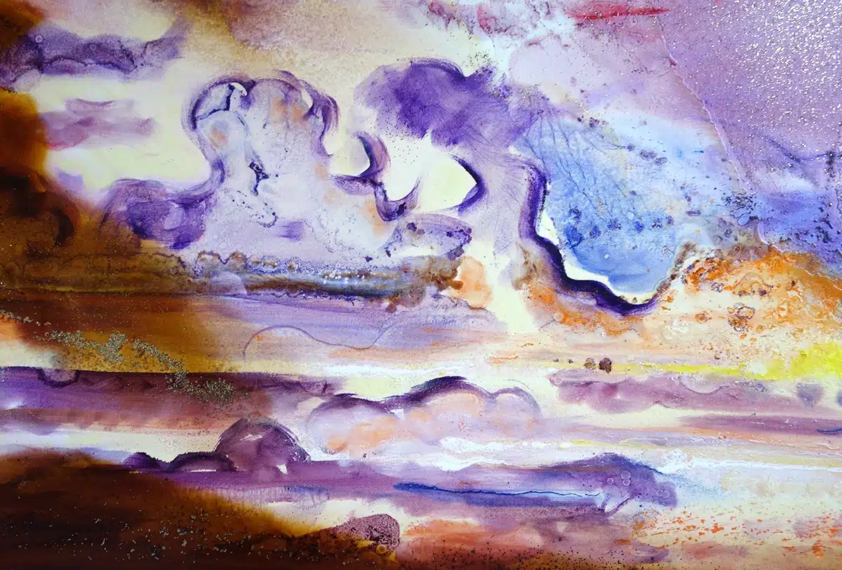 Das Werk LUFT ist inspiriert von einem Sonnenuntergang im fränkischen Dorf Weißenbrunn. Das Bild habe ich überwiegend mit verdünnten Ölfarben und Schellack geschüttet und die Leinwand auf dem Boden so hin und her bewegt, dass die Farben frei fließen konnten. So kam es zu dieser bewegten Komposition aus violetten, goldgelben und erdigen Tönen. Die transparenten Farbverläufe verschmelzen mit schnell gemalten Pinselschwüngen, die an Wolkenformationen erinnern. Zuletzt streute ich Glitter auf die Leinwand und pustete die winzigen Teilchen an bereits angetrocknete Farbränder. Wenn man an dem Bild LUFT vorbeigeht, sieht man die Schellackflächen glänzen sowie den funkelnden Glitter.