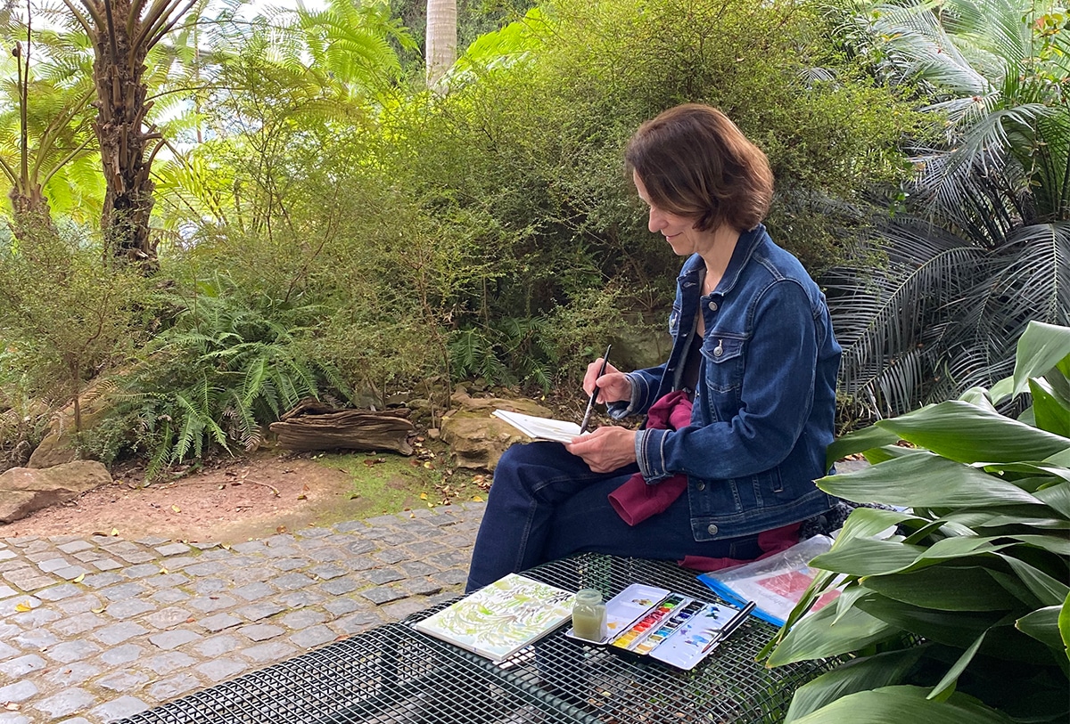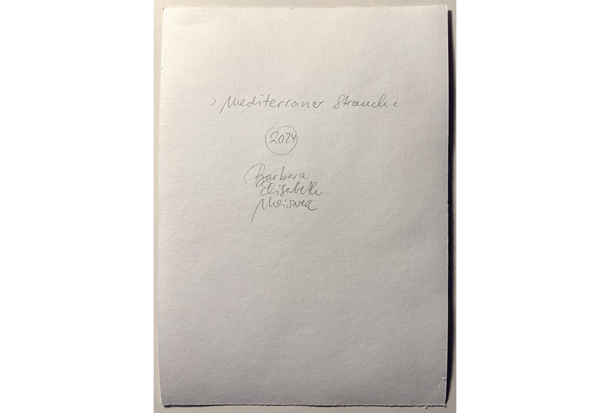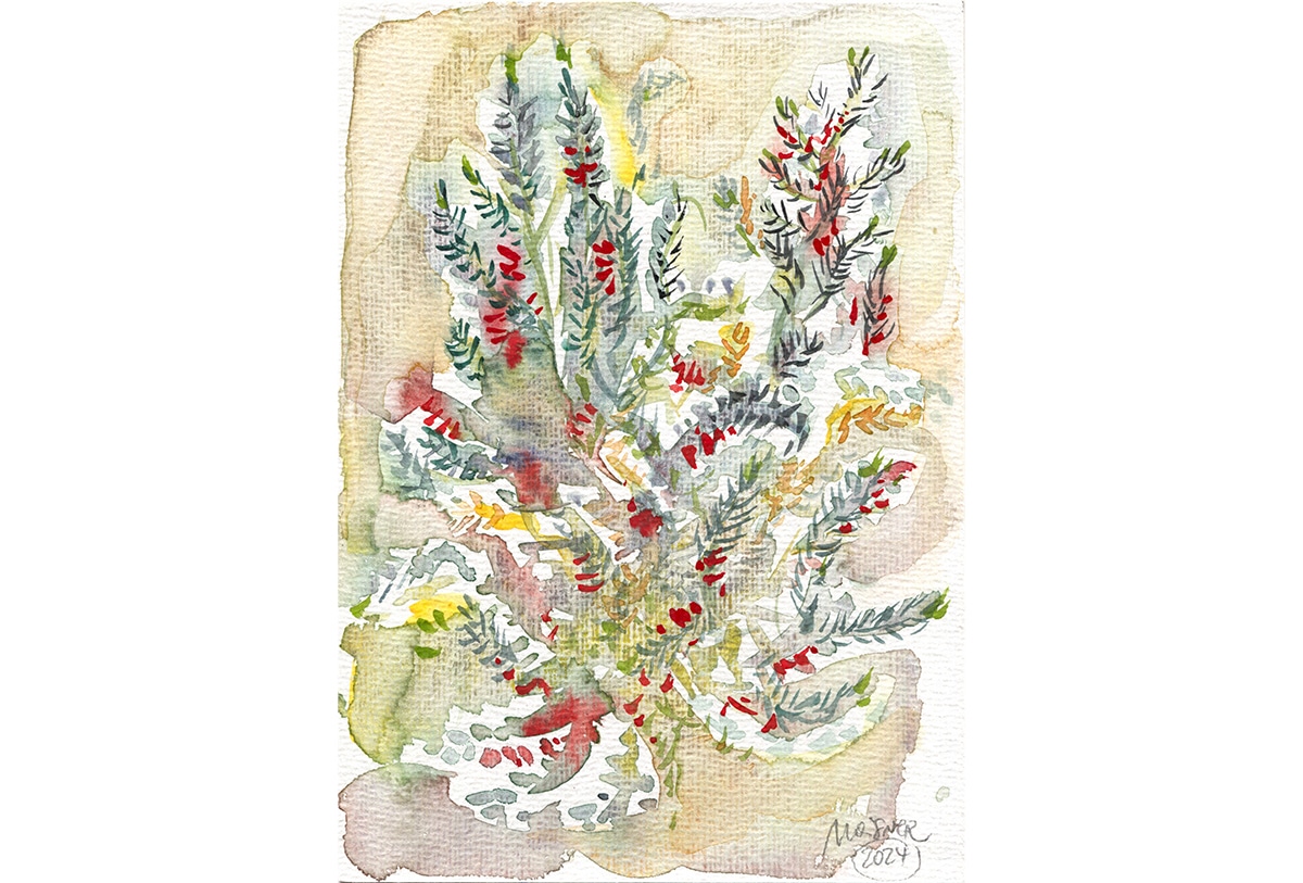 In dieser Kuppel saß ich also und aquarellierte wunderschöne Pflanzen. Malen ist für mich eine langsame, achtsame Annäherung an das Leben. Stille ‚Gespräche‘ mit der Natur sind immer heilsam. Immer! Mein Aquarell MEDITERRANER STRAUCH (Botanischer Garten Düsseldorf) ist für mich wie eine kleine musikalische Komposition und zeigt das rhythmische, strukturierte Wachstum dieser Pflanze.