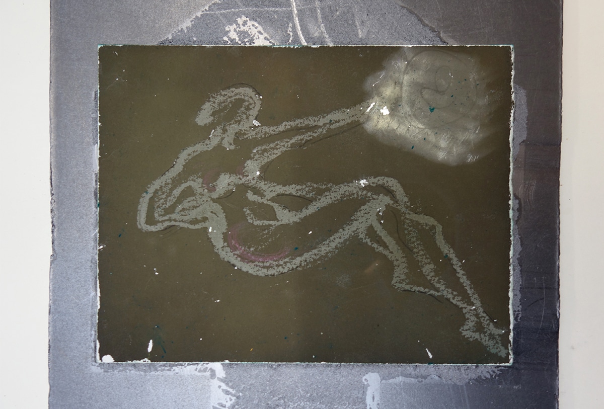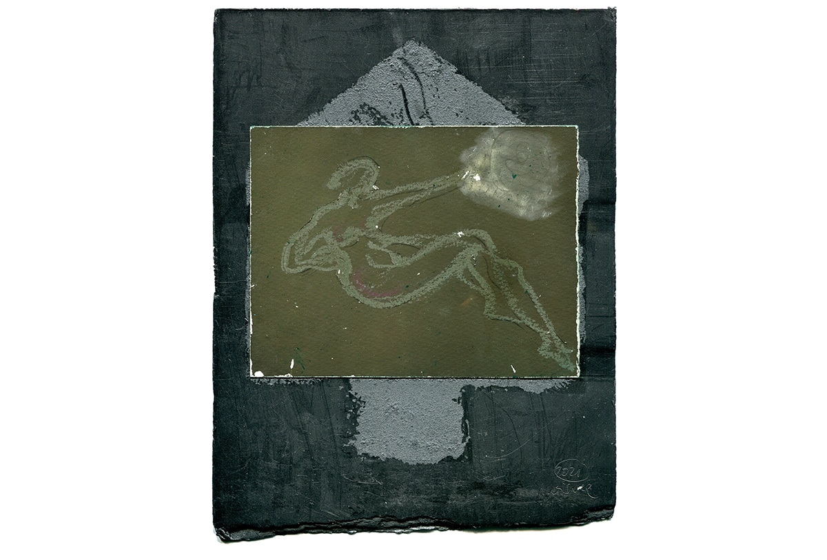 Original-Collage 26 x 20 cm, 2021, Graphitstift, Ölkreide, auf präpariertem Papier, collagiert auf einer Graphitplatte