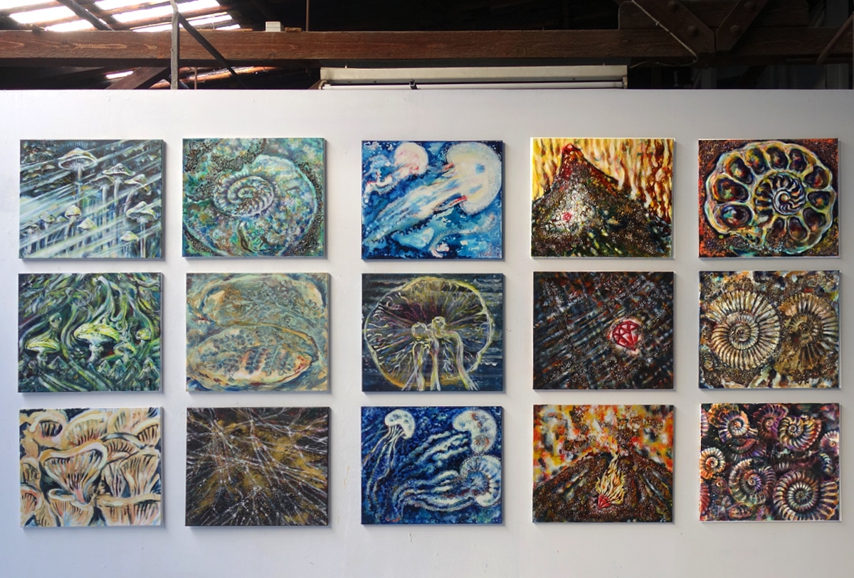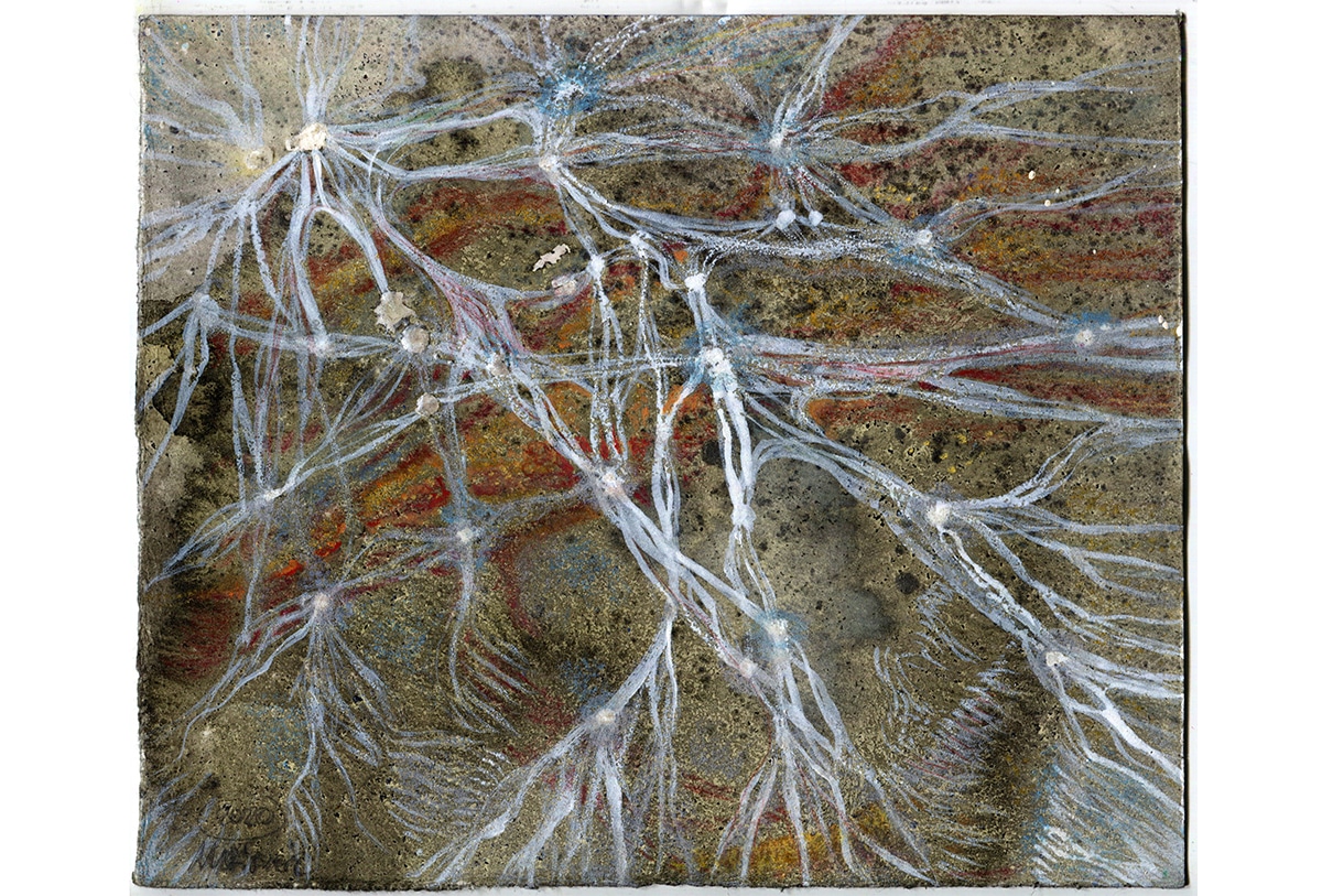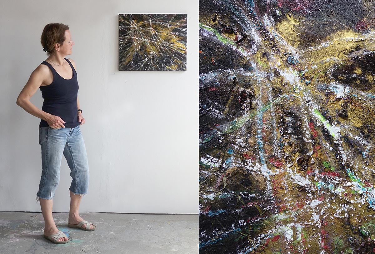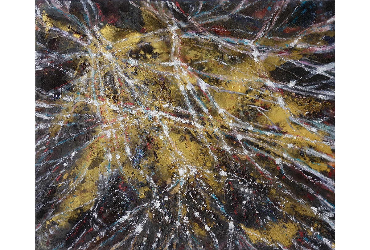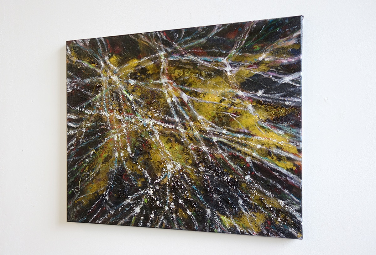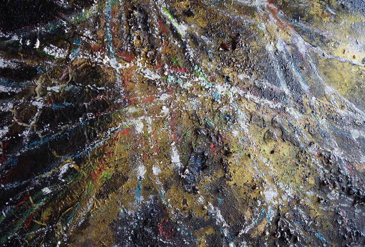 Original-Ölbild 50 x 60 cm, 2023, Ölfarbe, Walnuss-Sud, Schellack, mit Gummiarabicum aufgeklebte, zerkleinerte Walnussschalen, Ölpastellkreiden, Erde, Glitter auf Leinwand