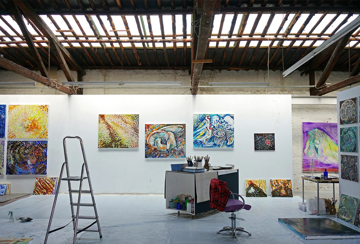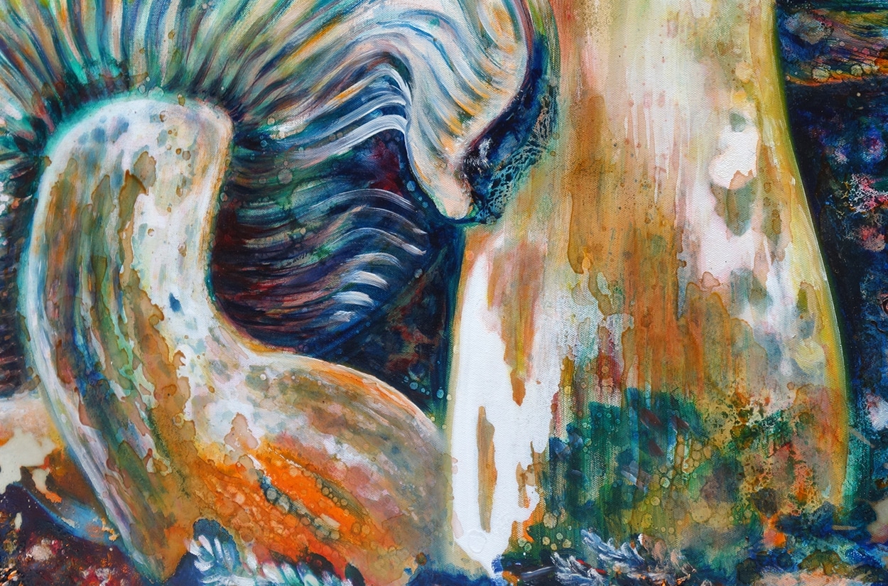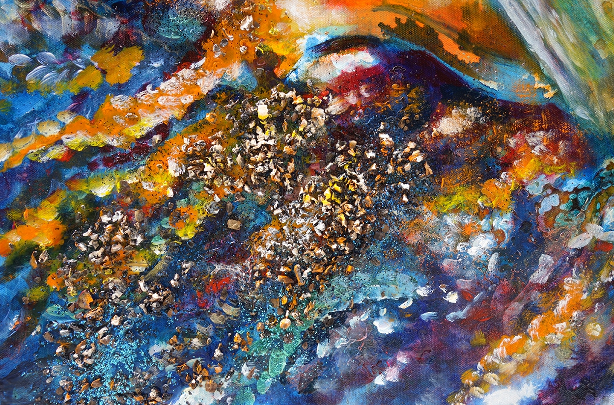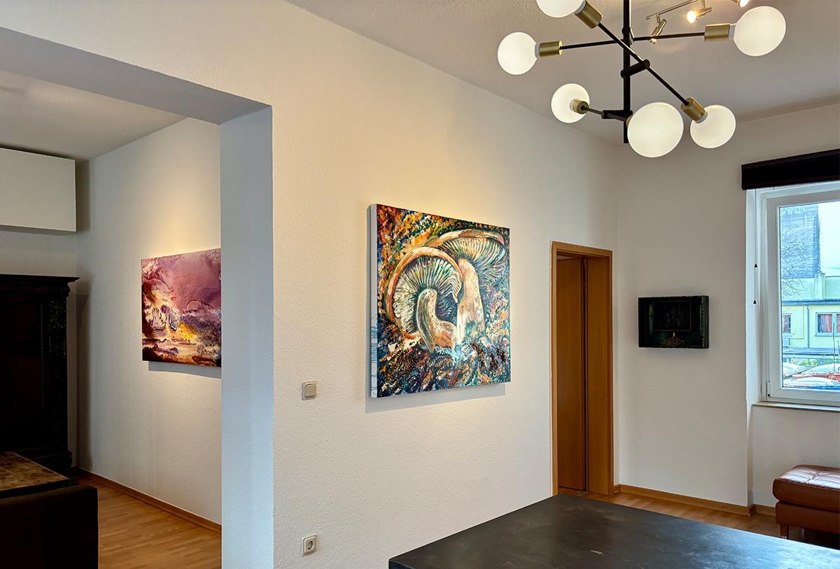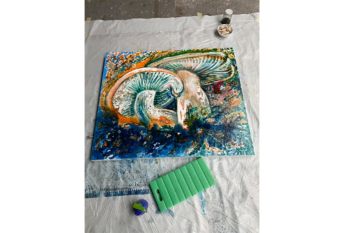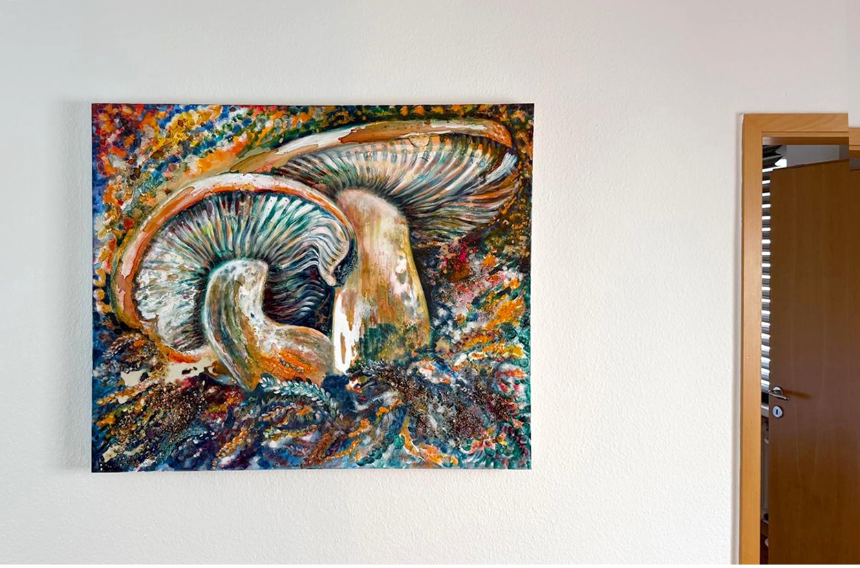 Das Werk PILZPAAR (BLUTREIZKER) zeigt zwei leuchtende übergroßen Pilzwesen, die majestätisch aus einem lebendigen, vielfarbigen Untergrund emporragen. Die erstrahlen in warmen Orange-, Rot- und Gelbtönen, die ich durch die kühl anmutenden, grün-blau schimmernden Lamellen malerisch kontrastiert habe. Sie ragen – eine Diagonale in der Komposition bildend – nach rechts oben. Umgeben sind die stämmigen Blutreizker von einem Geflecht aus Farnen, Moosen und anderen organischen Strukturen. Um den Waldboden dreidimensionaler zu gestalten, habe ich mit Gummiarabicum zerkleinerte und später bemalte Walnuss-Schalen, Erde und Glimmer auf die Leinwand geklebt.