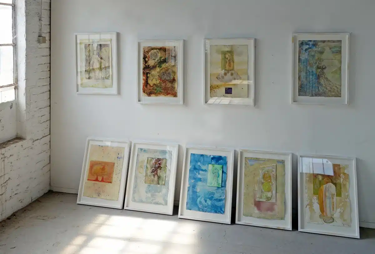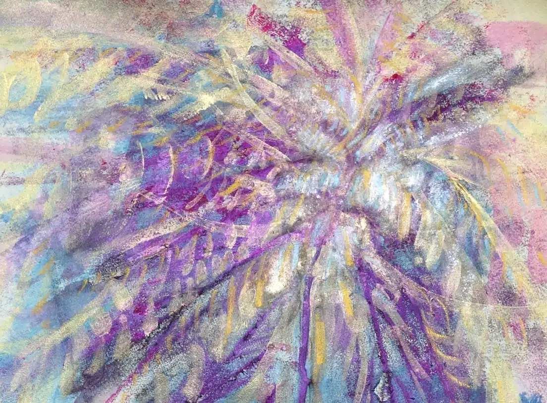 Collage mit Aquarellstift, Pigmenten, Leinöl, Goldfarbe, weiße Tusche + Frottage eines Schneeballkrautzweiges auf präpariertem Büttenpapier_53 x 40 cm, 2022