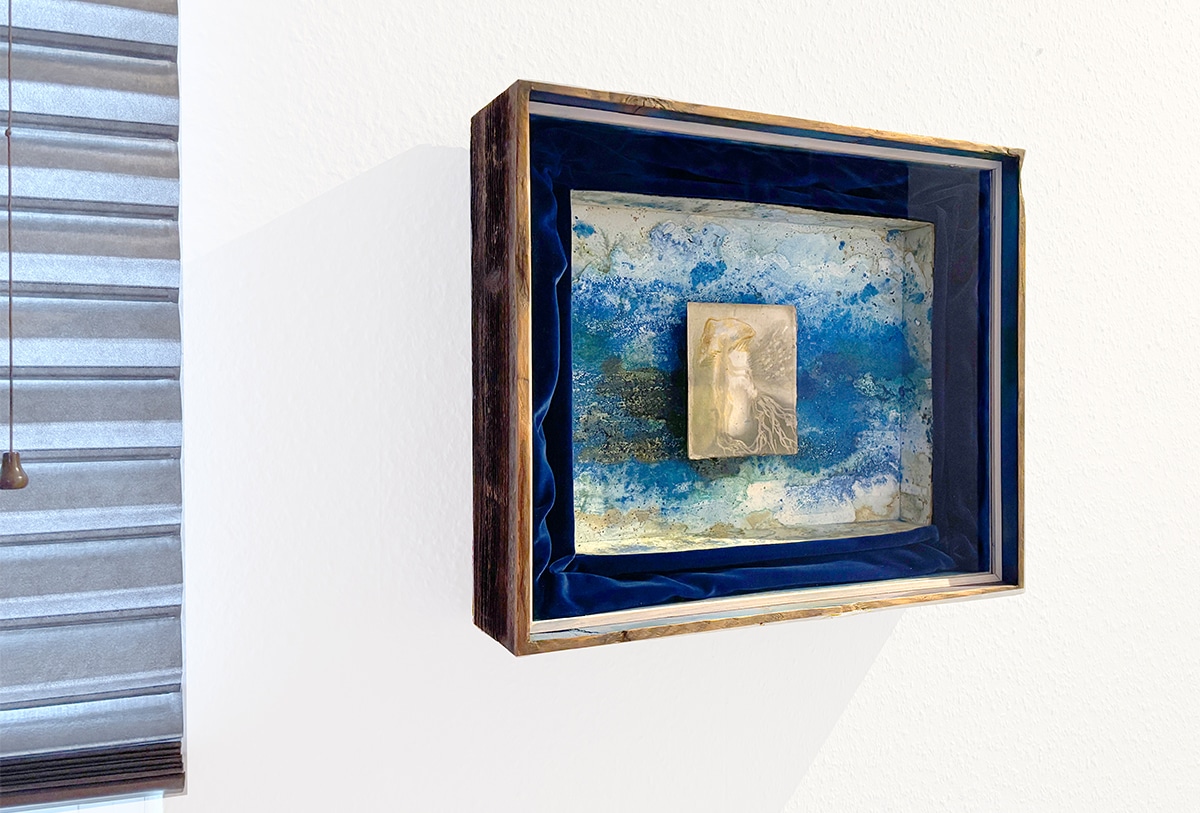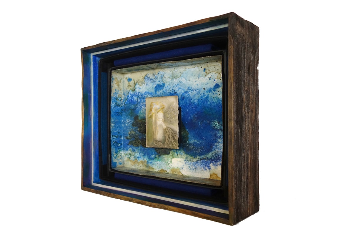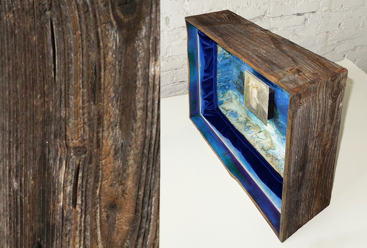 Handgefertigter Bildraum aus Altholz mit Museumsglas, ultramarinblauer Samt + Museumskarton ausgekleidet, mit Schellack, Pigment und bearbeitetem Papier + + Zeichnung 14,5 x 12 cm, 2017, Aquarellstift, Graphitpuder, Lack auf präpariertem Papier