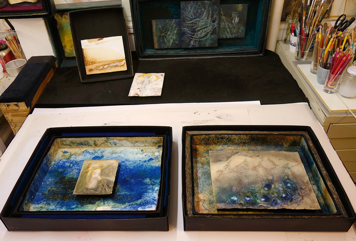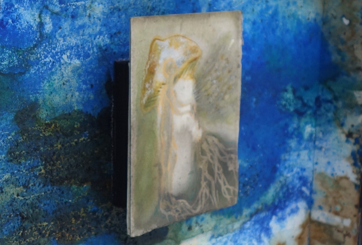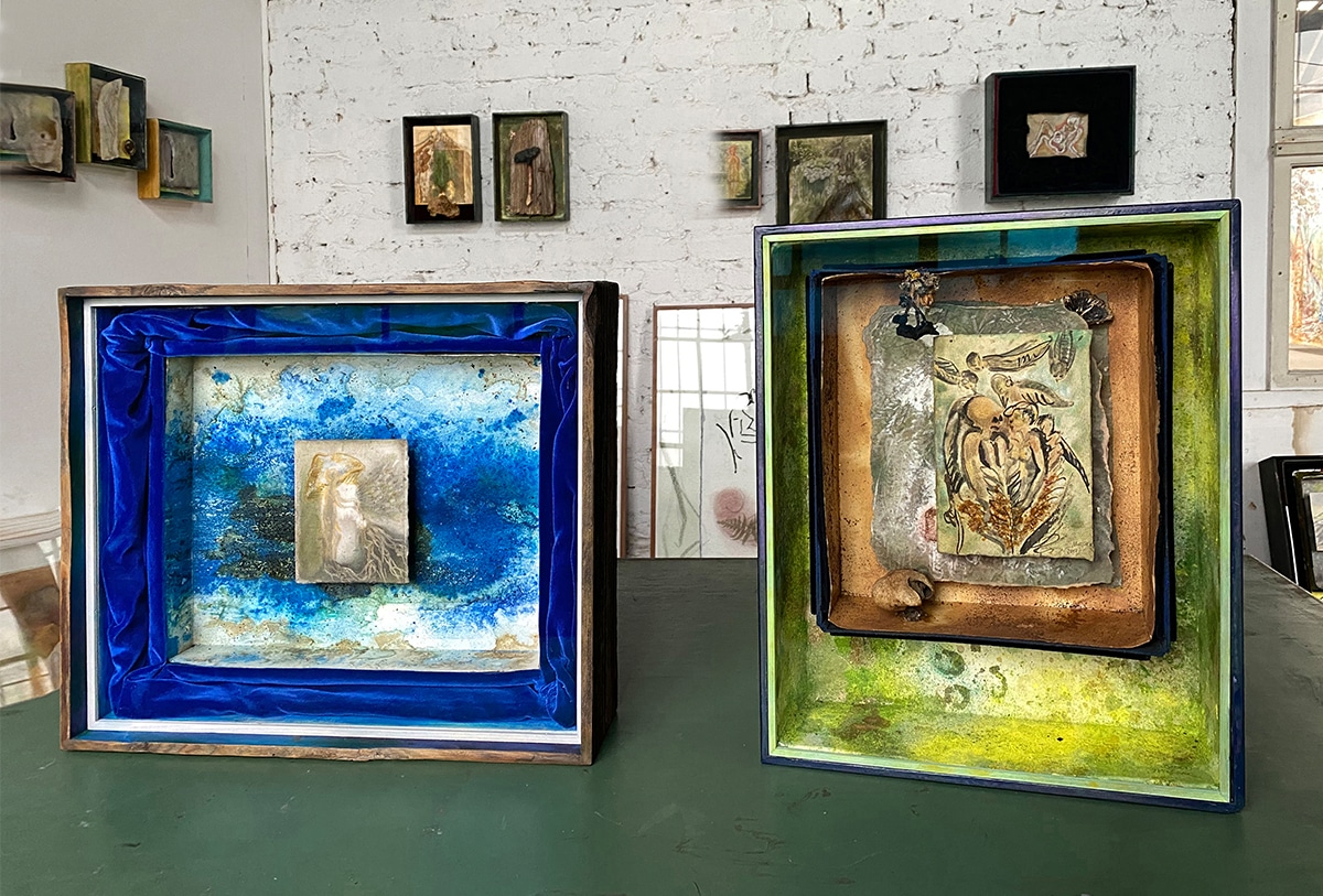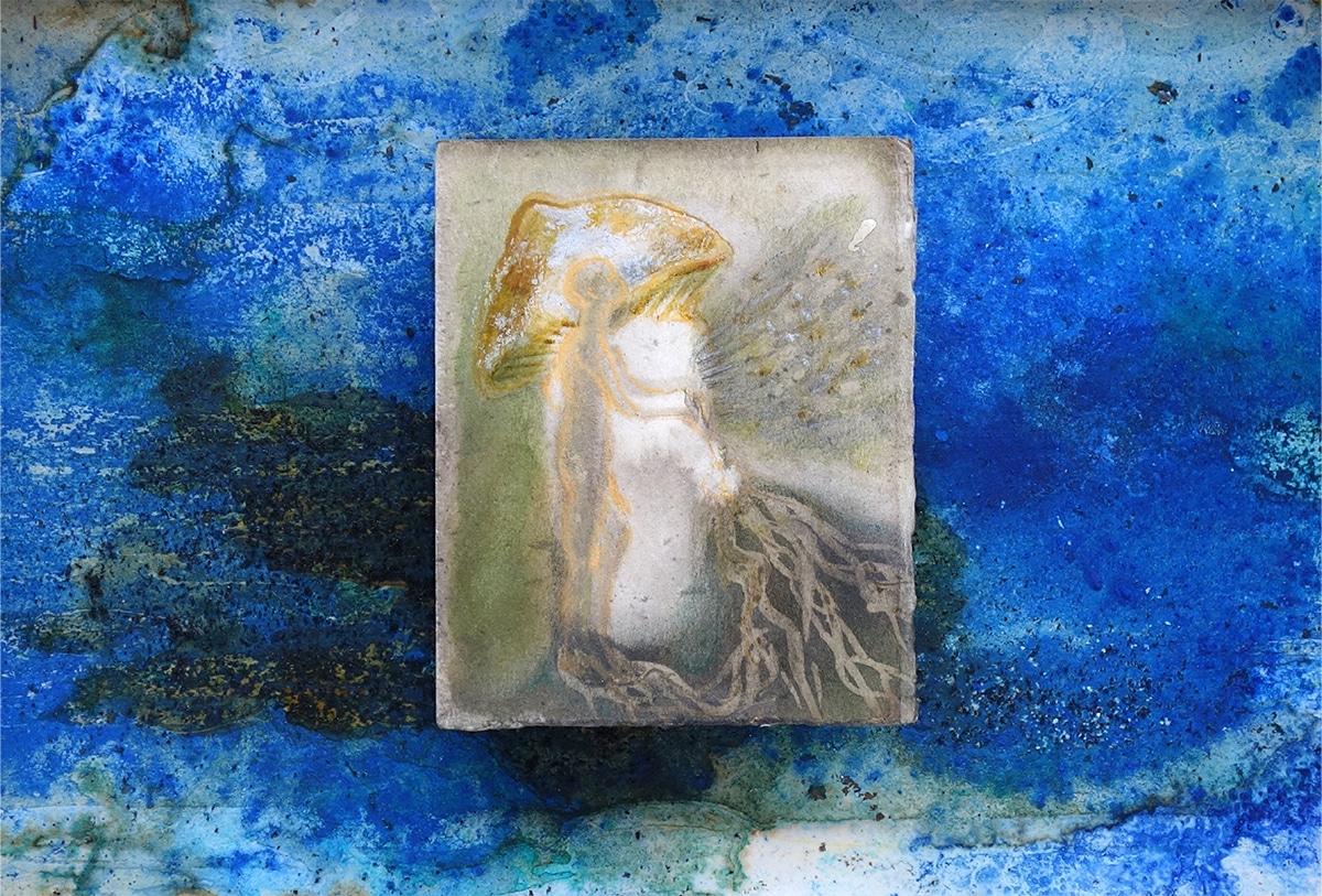 Handgefertigter Bildraum aus Altholz mit Museumsglas, ultramarinblauer Samt + Museumskarton ausgekleidet, mit Schellack, Pigment und bearbeitetem Papier + + Zeichnung 14,5 x 12 cm, 2017, Aquarellstift, Graphitpuder, Lack auf präpariertem Papier