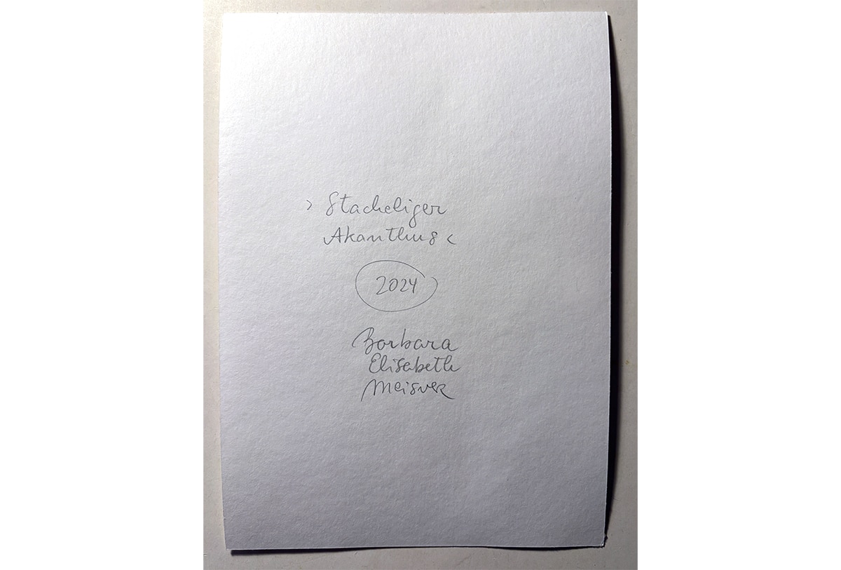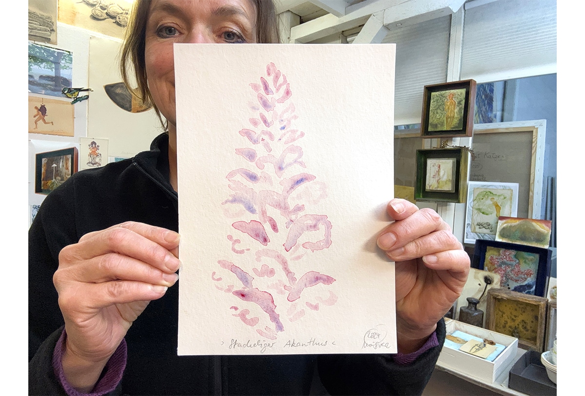 Ich lebe mitten in Düsseldorf in der Nähe des Hauptbahnhofs. Um meine Verbindung zur Natur zu pflegen, fahre ich oft mit meinem Fahrrad in den Südpark. Dort entdeckte ich 2024 ein Feld voller leuchtender Akanthus-Stauden. Ich schuf dieses Aquarell, das nur das Wesentliche einer Akanthusblüte zeigt. Ich habe es absichtlich in einem einzigen Schwung gemalt und nichts mehr hinzugefügt. Eine rosa-violette Farbfrequenz, die sich kegelförmig auf der weißen Fläche des Aquarellpapiers nach oben verjüngt. Ich mag dieses Aquarell besonders gerne, weil weniger manchmal wirklich mehr ist – wie bei diesem kleinen Werk Stacheliger Akanthus.